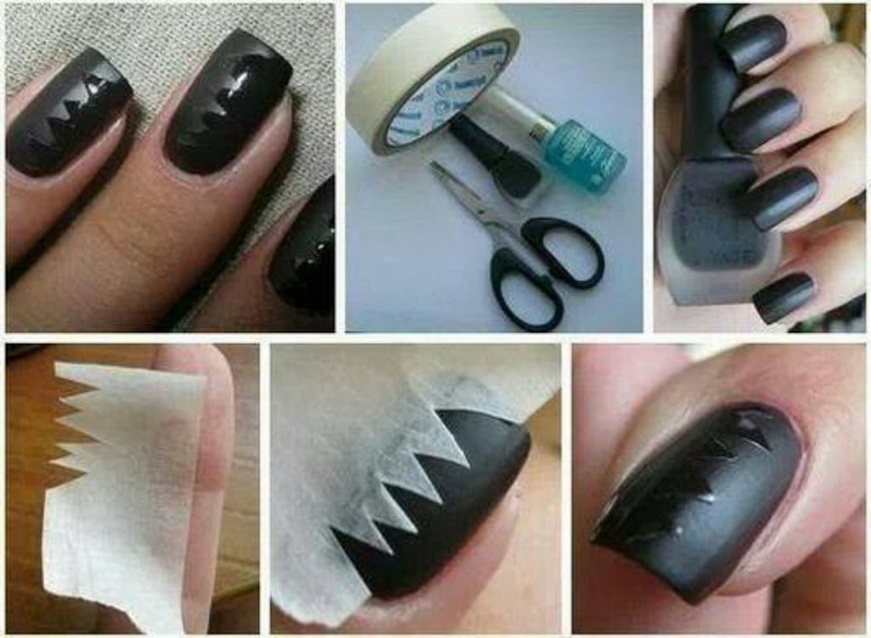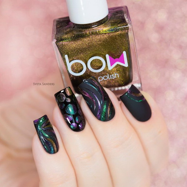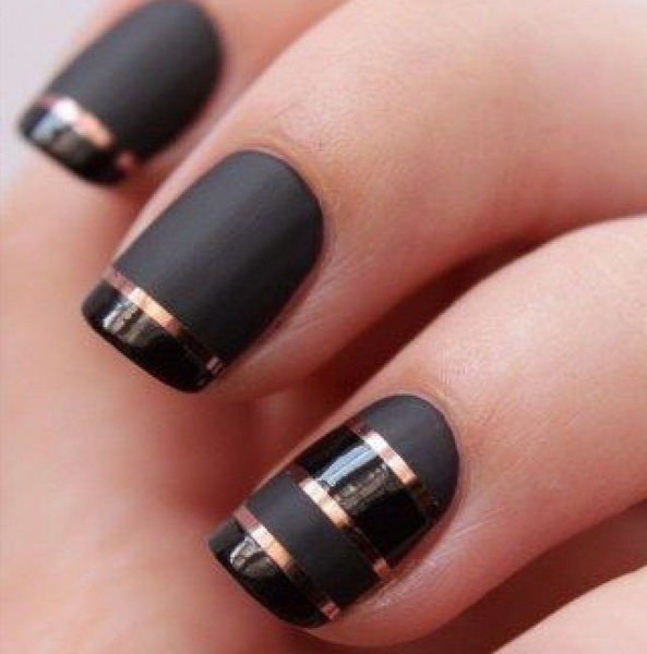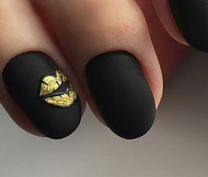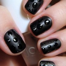 If the master of nail art owns drawing skills, he can create a unique design on a concise matte basis of black color. Someone for this rather thin brush, modeling gel and fantasy. Someone creates patterns with special pens with acrylic pigments. Black color is unique in that even ordinary stripes or peas can look stylish and impressive on it. For example, dots can mark the hole or shackle french.
