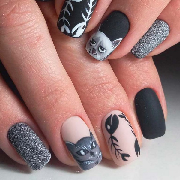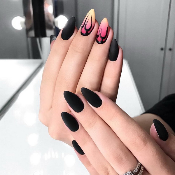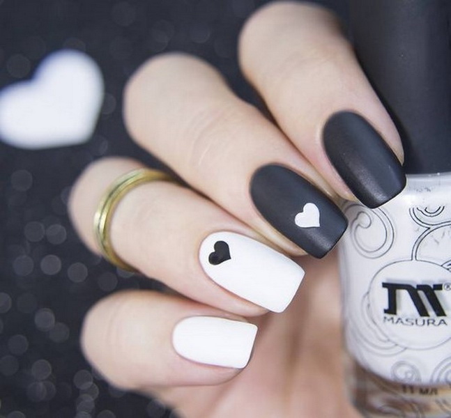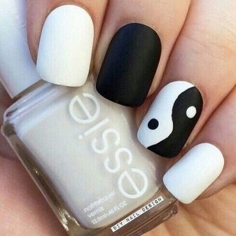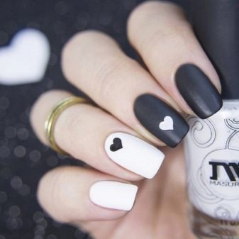 Combining black matte lacquer with sharply opposite tones of the color palette, you need to take into account that such a neighborhood often needs a smooth transition from one color to another. Therefore, for accents in this case, usually use two nails on each hand. If, for example, the accent nail is painted white, it is worth softening the contrast that is harsh to the eyes with a simple black pattern. On the second nail, a black print should dominate, thus connecting the white pigment to the main background.