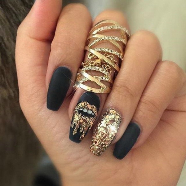 If the master's hand does not tremble and the lines are confident, such a design is able to contend with the stamping. It is often enough to highlight the pattern of silver pollen or a pair of rhinestones of the smallest size.Look beautiful on a black matte-based designs in a glamorous style (for example, golden lips, crowns, stars). A seasonal print (snowflakes, feathers, leaves, ears of corn, flowers) is no less expressive on this background.