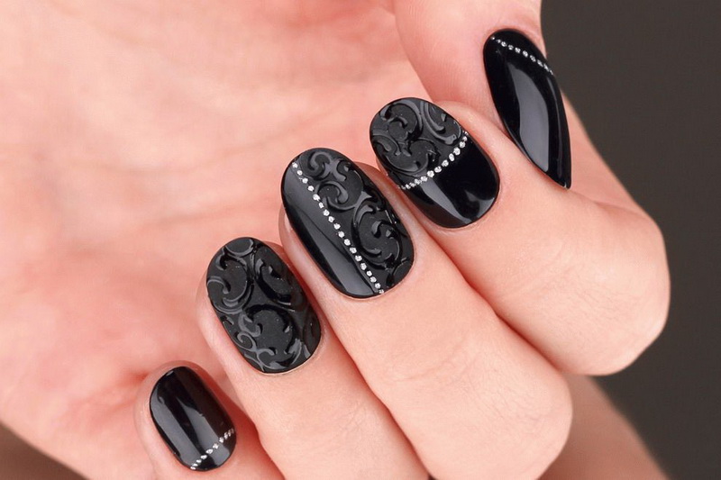 Good black matte varnish and the fact that it can be used by women of different age categories. In addition, black manicure today is not considered to be something extra-ternary: it can be worn not only by fans of the Gothic subculture. It is great for complementing women's bows of different styles. Depending on the type of decor used and the design theme, it can be decorated with:
