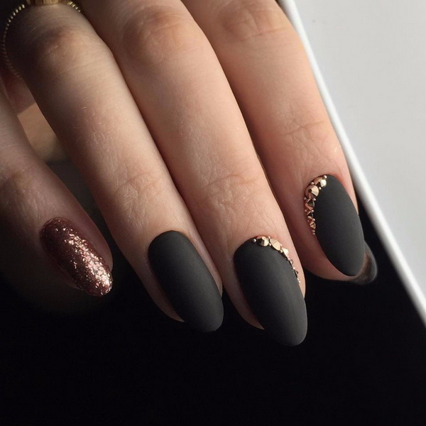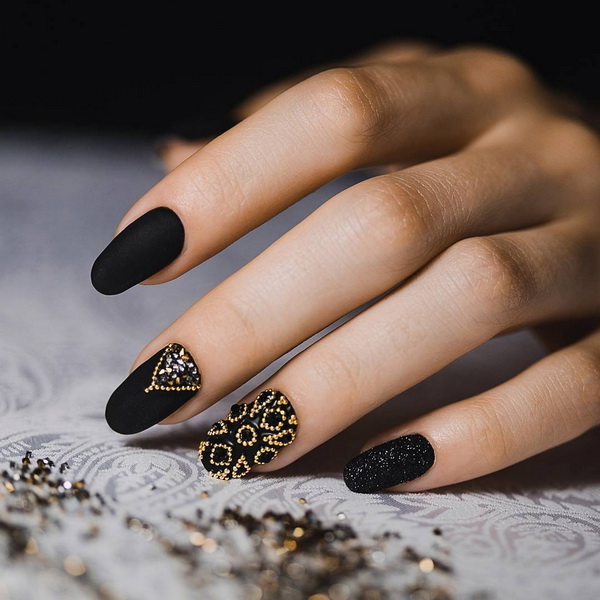 Black looks noble and status along with violet, dark blue and emerald tones. Due to the matte texture of the coating, the combination looks soft, such colors make it possible to improve evening bows.If you want to use a black manicure for everyday images, you can combine the basic pigment with beige, nude tones.
