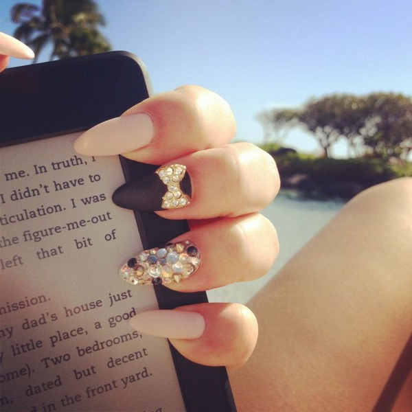 - The original interpretation of the jacket in the form of a gold-plated bow. A good option for every day for long nails.