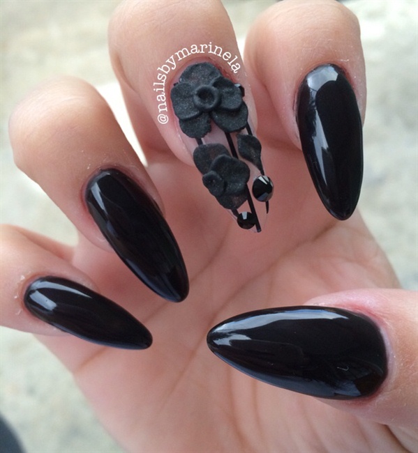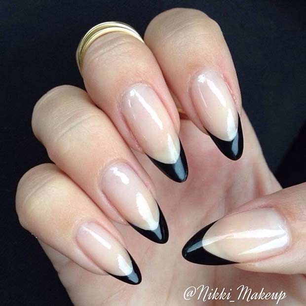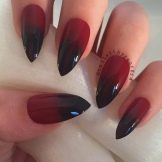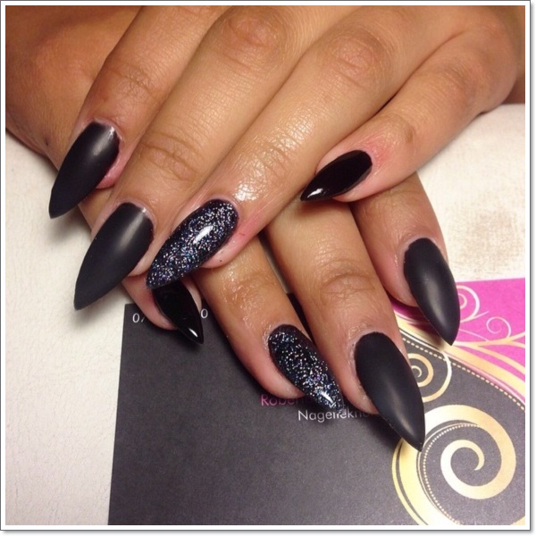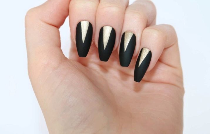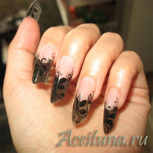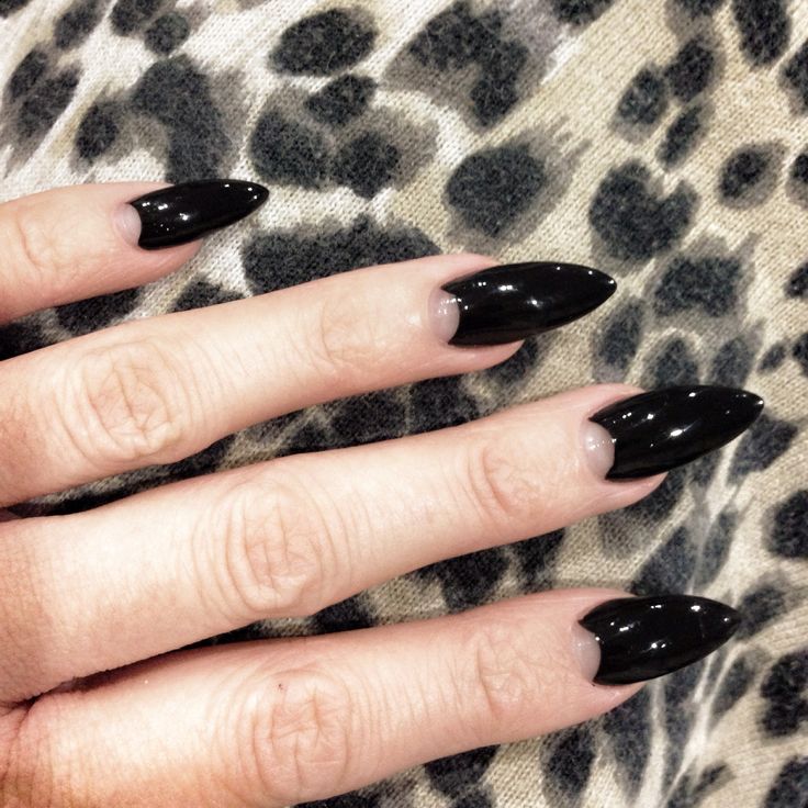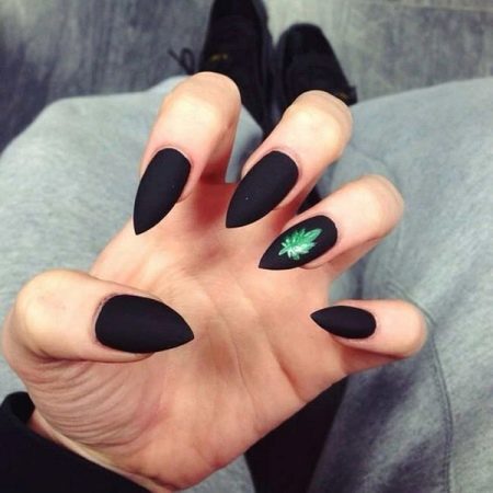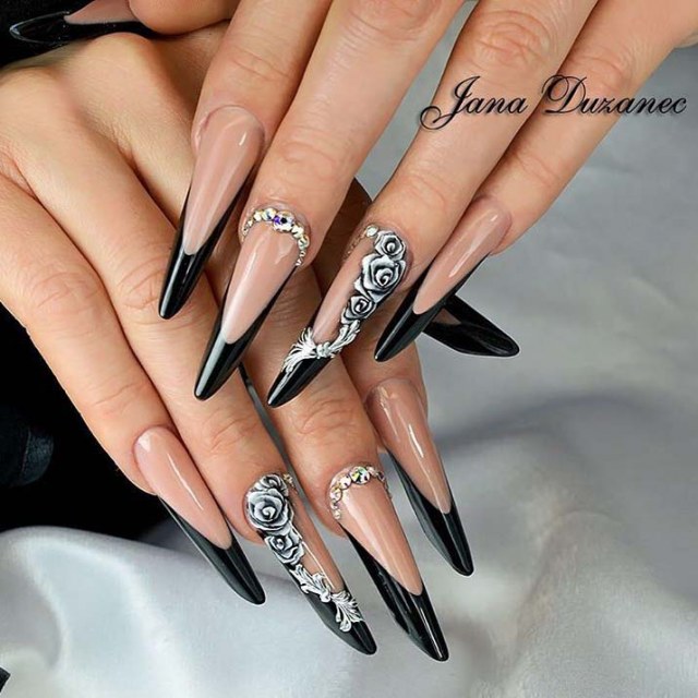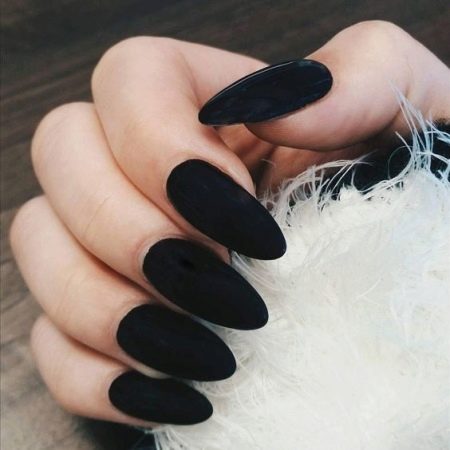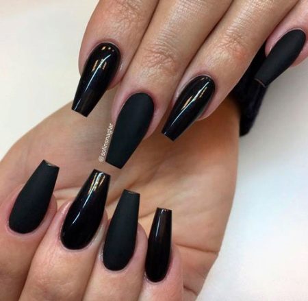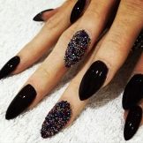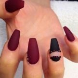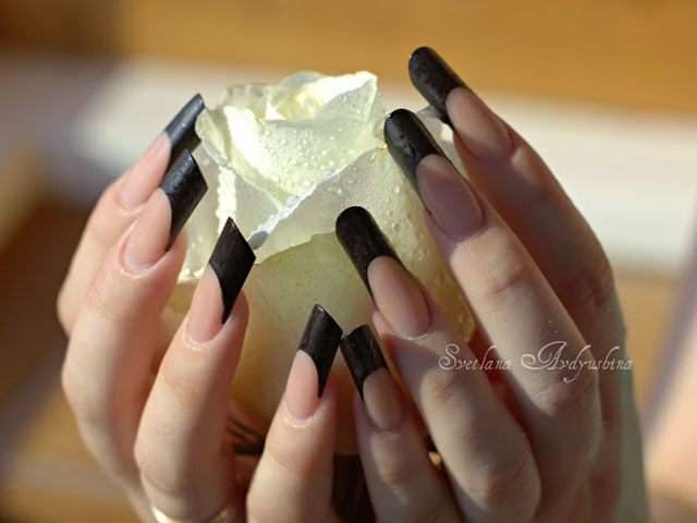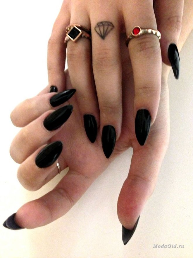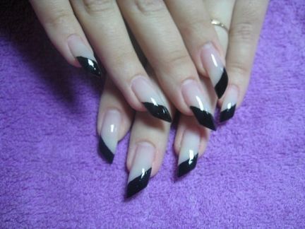 Design on sharp and long peaks can be anything, as modern materials allow to embody any fantasy of the client. One of the most spectacular and dramatic is black lacquer - both glossy and matte.
