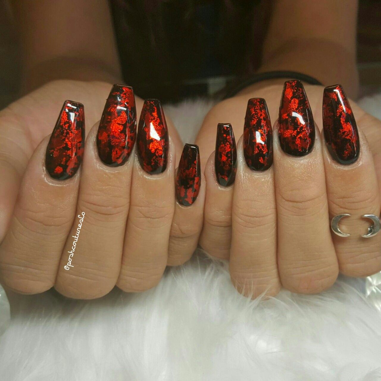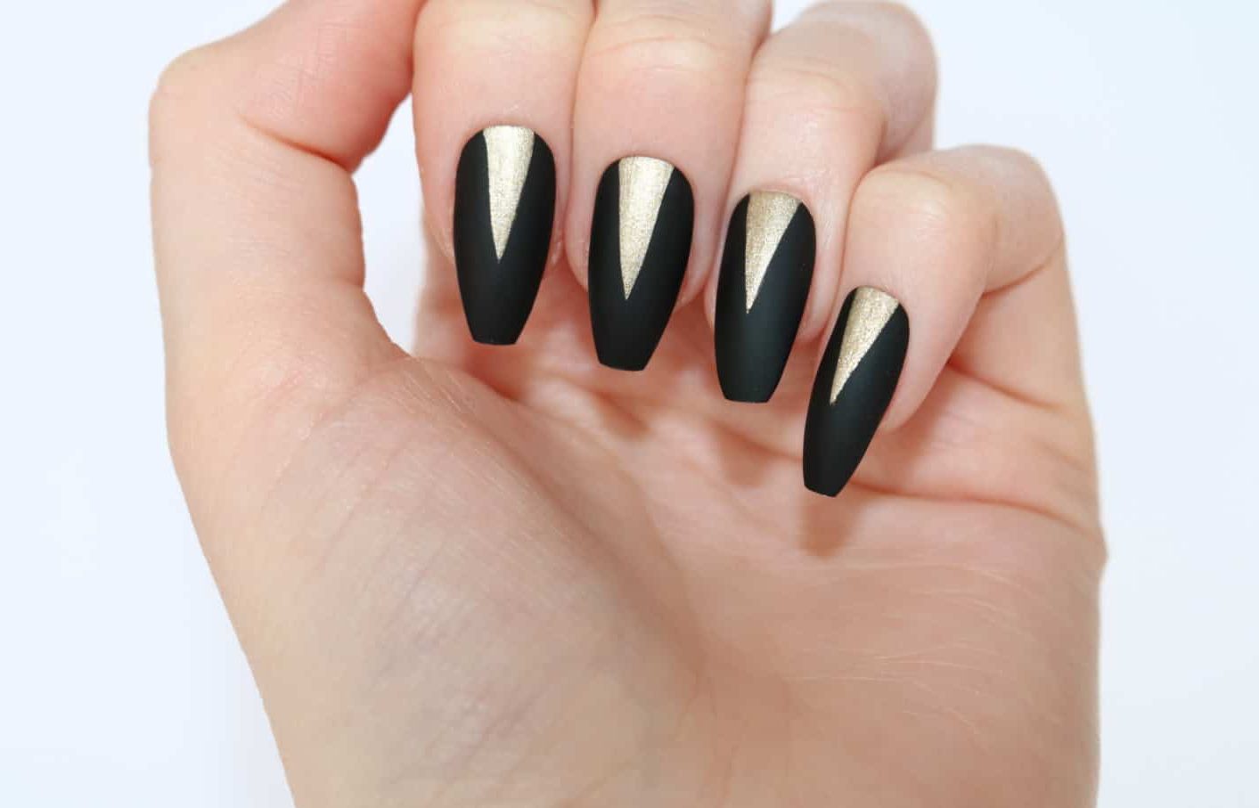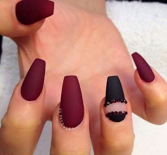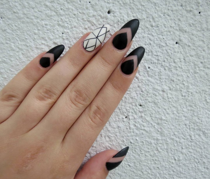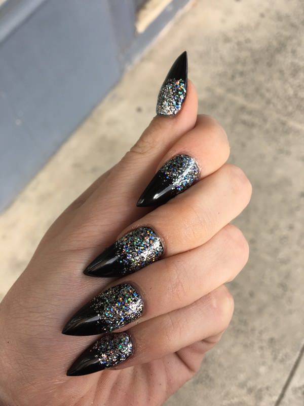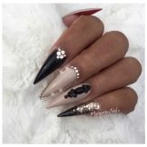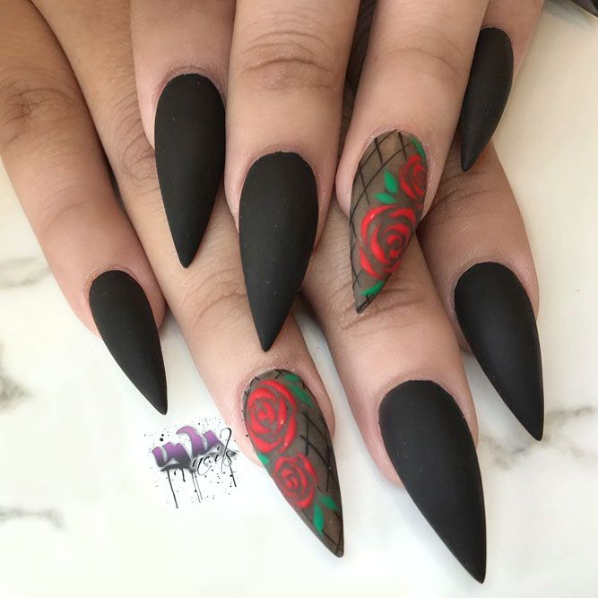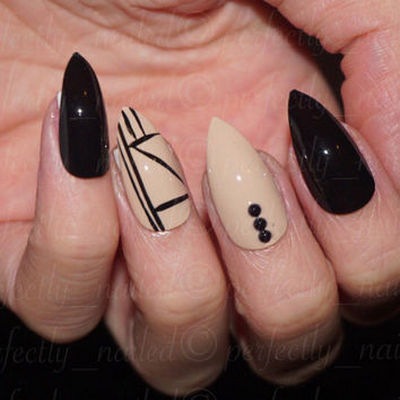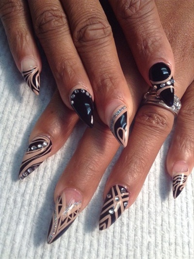 Design on sharp and long peaks can be anything, as modern materials allow to embody any fantasy of the client. One of the most spectacular and dramatic is black lacquer - both glossy and matte.