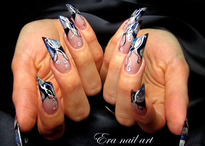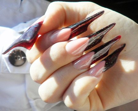 - Long "peaks" - "stilettos" - the most spectacular, but uncomfortable nails. The length is limited only by the fantasy of their owners. Often on stilettos performed frilly design, which makes them even more noticeable.