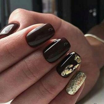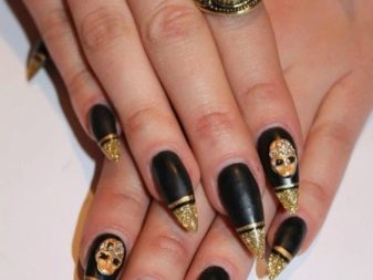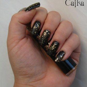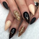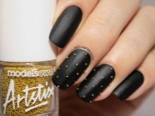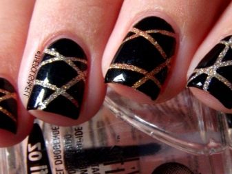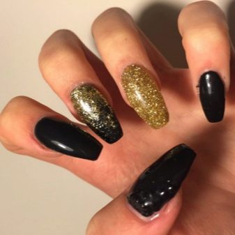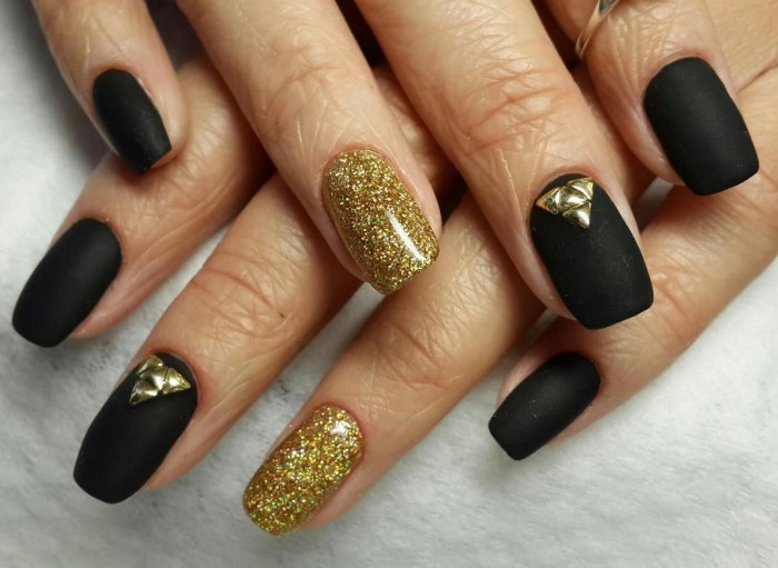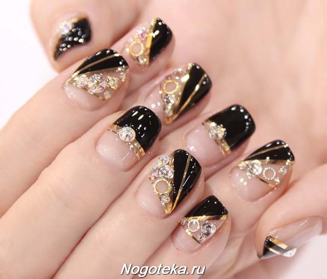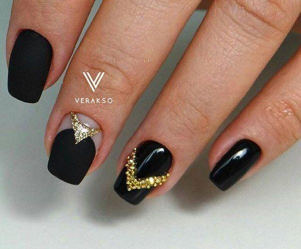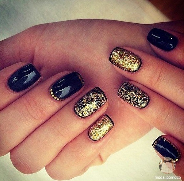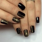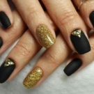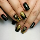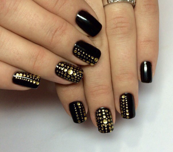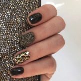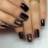 - Paint all the nails black. From above on a basis apply decorative gold elements in different technicians. Use a rub, foil, varnish or glitter. A great option is to lay out the contour of the nail on one finger with golden rhinestones, and the other to fully decorate with sparkles. This design will look complete and unusual.