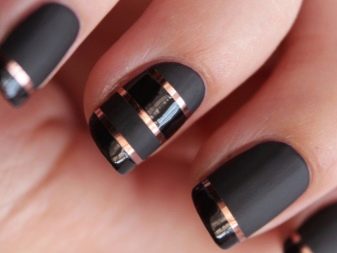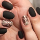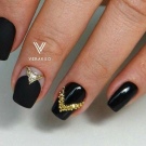 There are many interesting options for creating designs using black tone and brilliant gold. Matte black varnish is well suited for everyday manicure. Cover them with most of the nails, and two or three nails cover with brilliant gold. This nail design will look quite interesting, attractive and not very catchy.