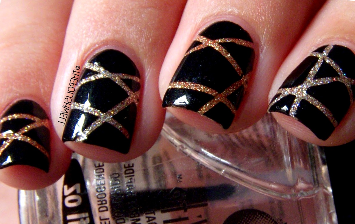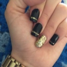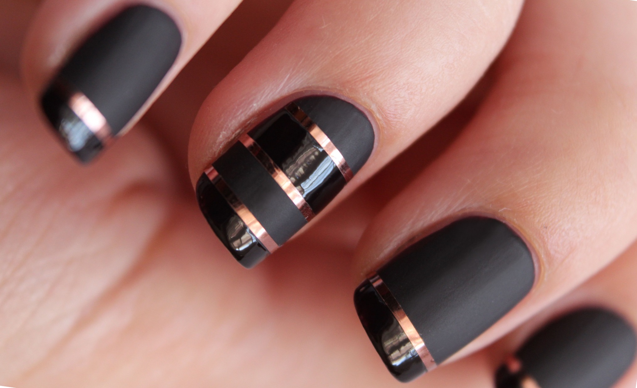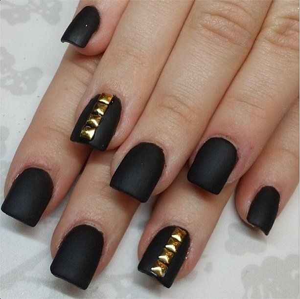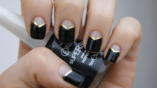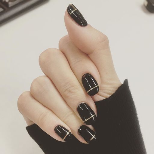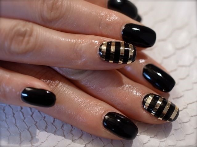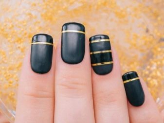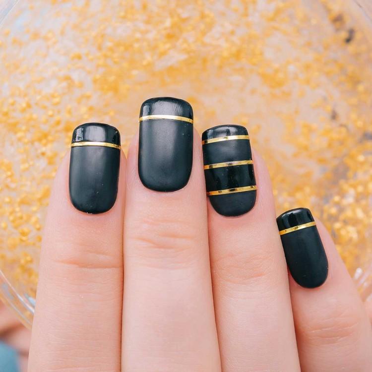- Apply a matte black color to all nails. Decorate with shiny gold stripes.