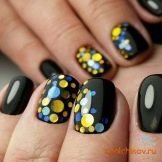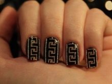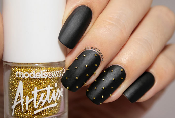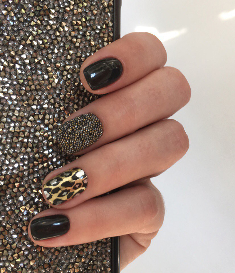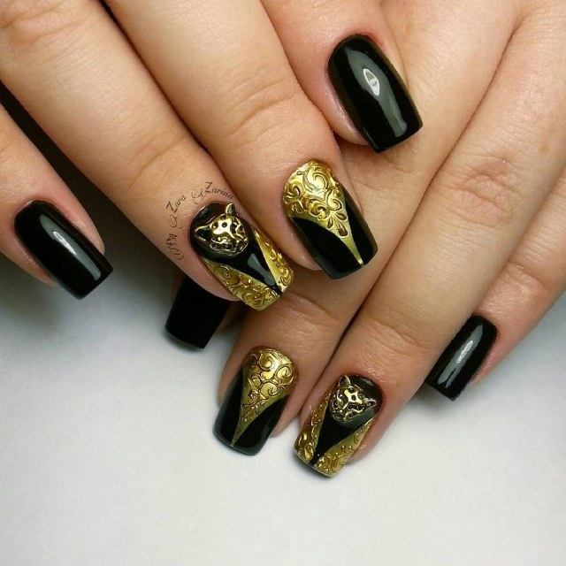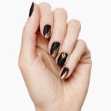 To create an unusual nail design, you can use ready-made elements for decoration. You can buy interesting sequins, various colorful figures, inscriptions. Use techniques with 3D elements. On the main black color with a special glue, you can attach gold rhinestones or figurines.