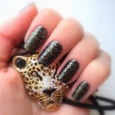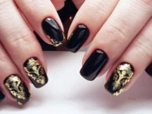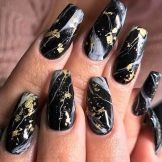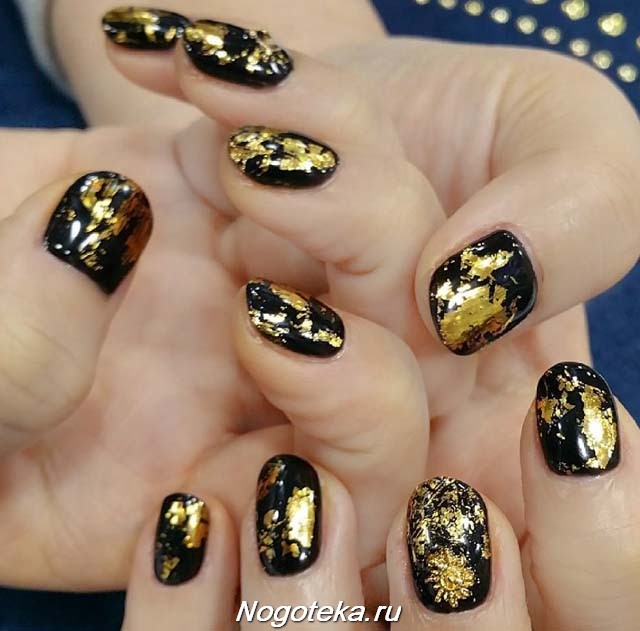 - Translated foil will help create interesting patterns or scuffs. Apply the main black color, and then cover the individual areas of the nail plate with a special glue, acrylic or gel. Apply a foil to a nail, press and tear off. On the areas with the applied material will remain a golden accent.