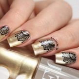Golden pictures on a dark background look impressive or vice versa. Such a manicure is better to cover with a glossy finish. It is worth looking at the current patterns.