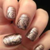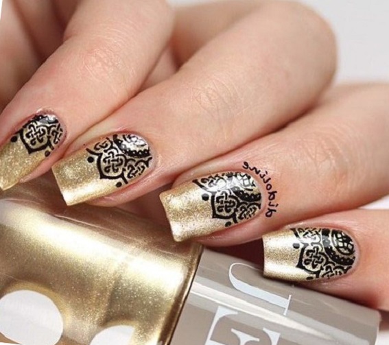 Gold prints on nails are very popular. Stylish and unusual geometric patterns look unusual. This design is easy to do at home. Openwork gold painting will give your hands a grace and a special charm. Use ethnic motifs to create an unusual design.