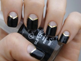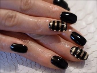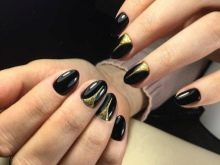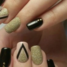 - To create a solemn manicure, you can completely cover several nails with black lacquer, and the rest with gold. On shiny nails, draw geometric shapes with sharp black lines. This design looks elegant, but succinctly.