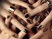 Manicure in black should be simple, but not boring. Fashion gurus propose to use a golden coating for decoration. Such a manicure will look expensive, and your hands will always attract the attention of others. Use intricate patterns, foil of different textures, stencils or rhinestones to create a unique image.