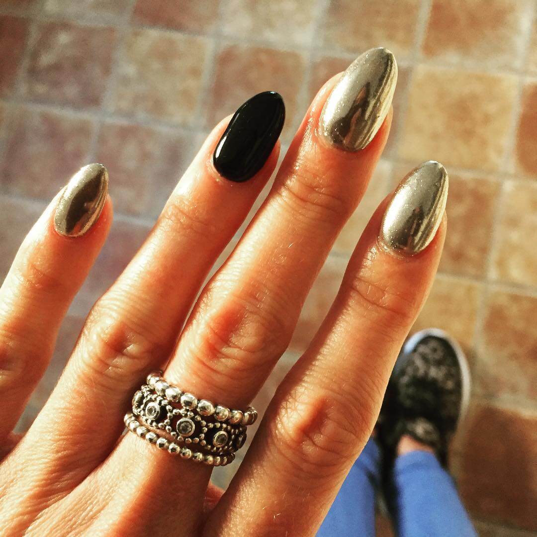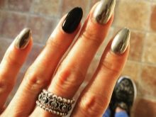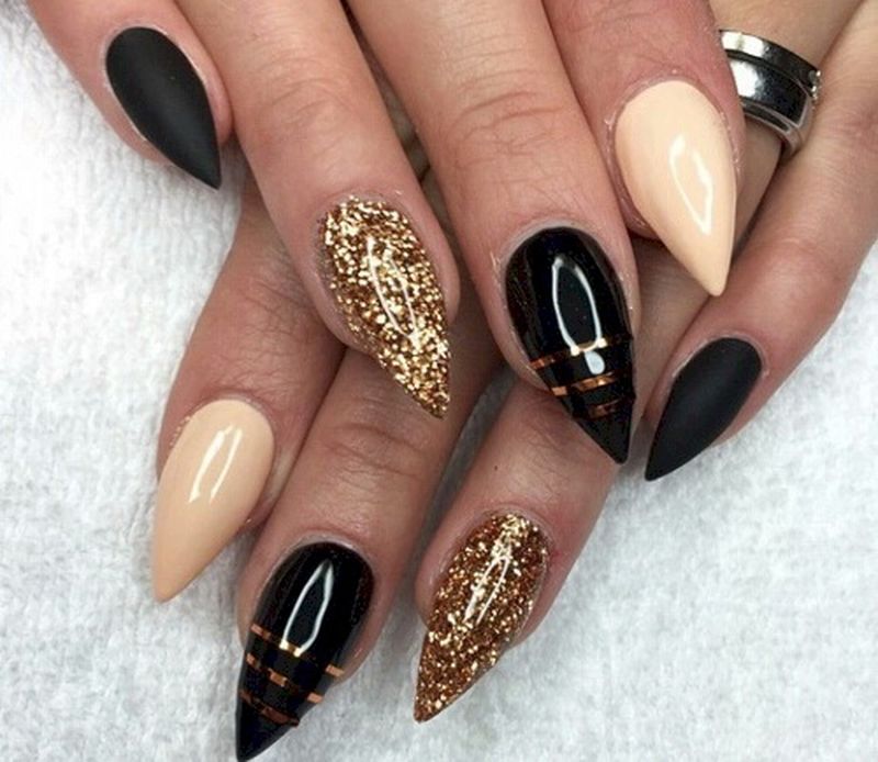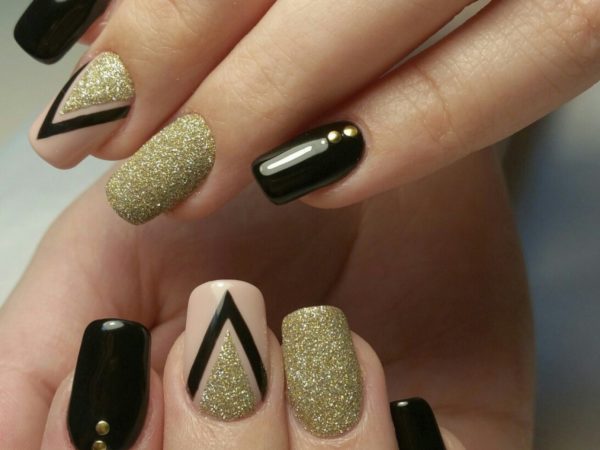 The correct combination of brilliant gold with laconic black gives the manicure a luxurious look. The design looks expensive and bold. The combination of such tones is well suited for courageous girls who are ready to experiment. Colors are best combined with different options.