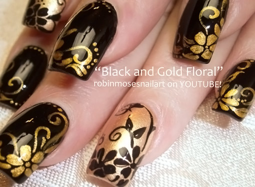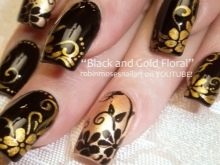 - It looks interesting flower ornament, plants in combination with rhinestones. Apply stones and a gold-colored pattern on black nails.