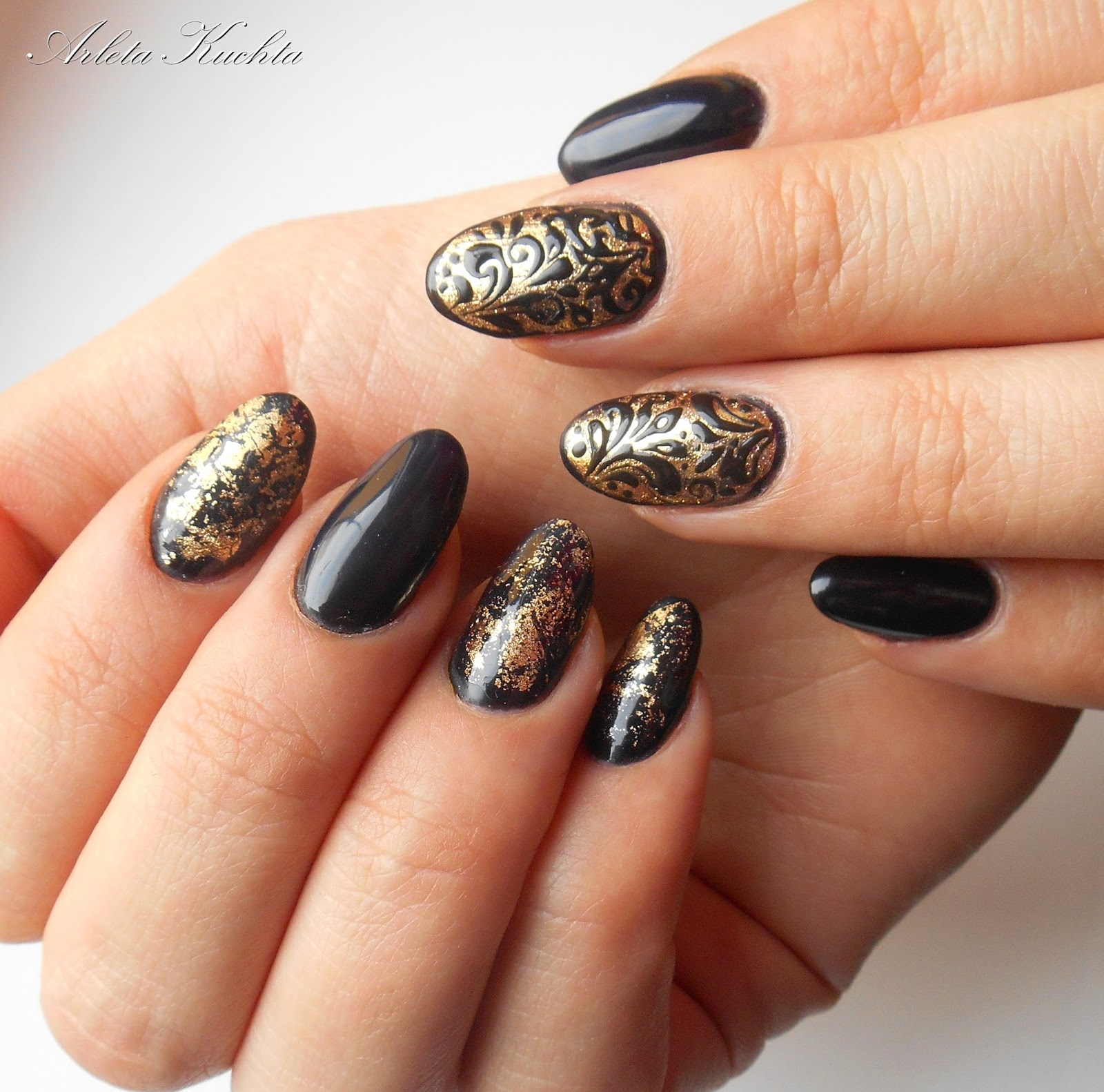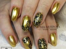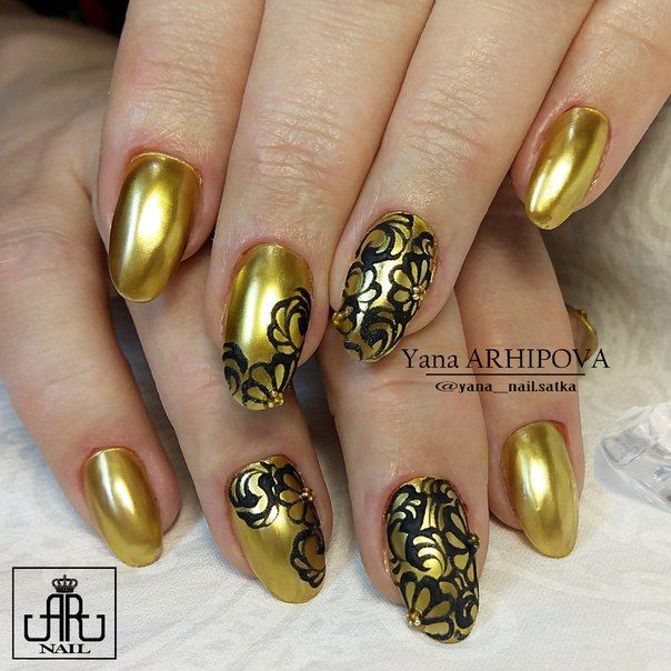 - Decorate the gold nail plate with neat black monograms and curls. It is interesting to look dark nail with a shiny contour and pattern.