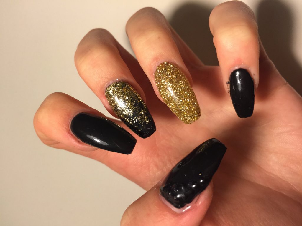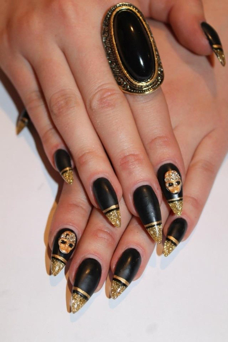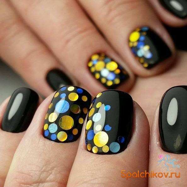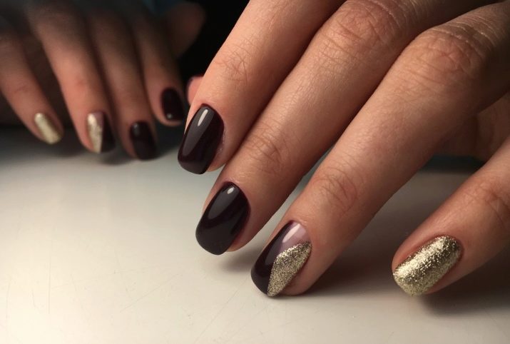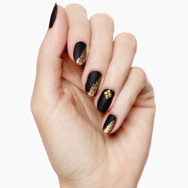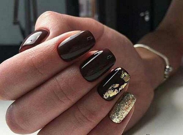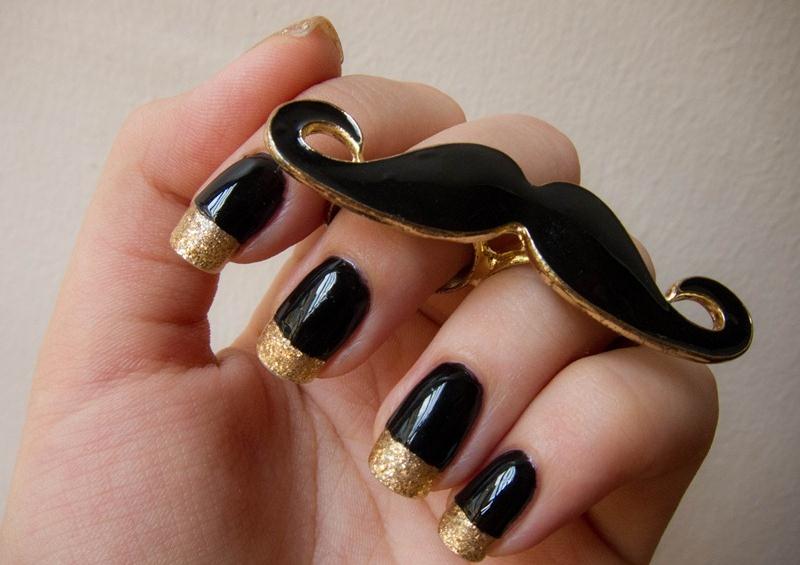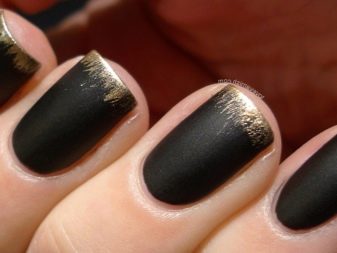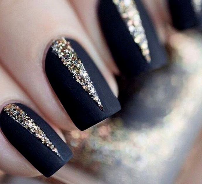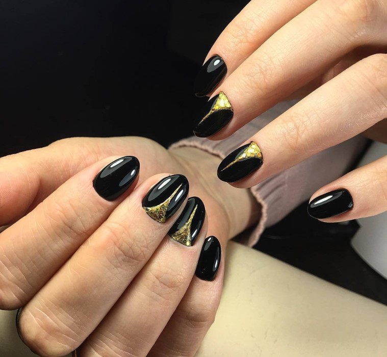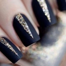 With the help of small sparkles, you can create a manicure in the technique of a gradient. Cover the nail with black lacquer and apply gold on the tip so that it disappears to the cuticle. Gradient design will visually lengthen your nails. Manicure is ideal for short or medium nails.