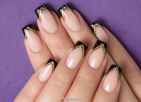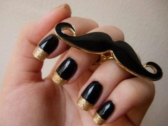 - An interesting technique involves the alternation of shades on the nails.On one nail, paint a neat smile with gold polish, use the next black. An interesting design is obtained if you make a golden French manicure on two nails, and on the rest - black.