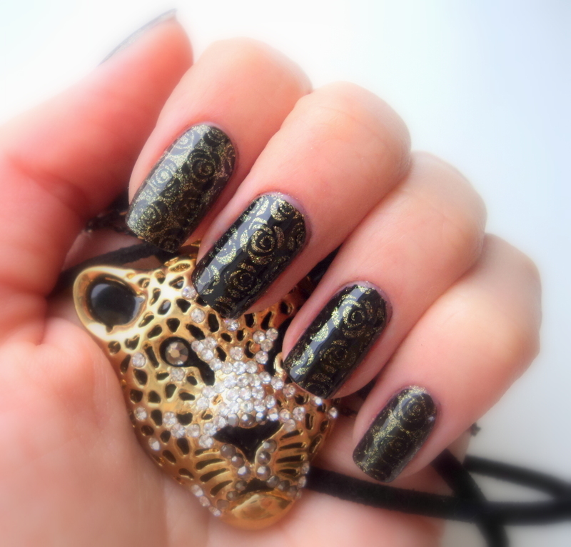 - Cover the nail with a dark color and randomly print gold foil. Imitate the scale pattern.