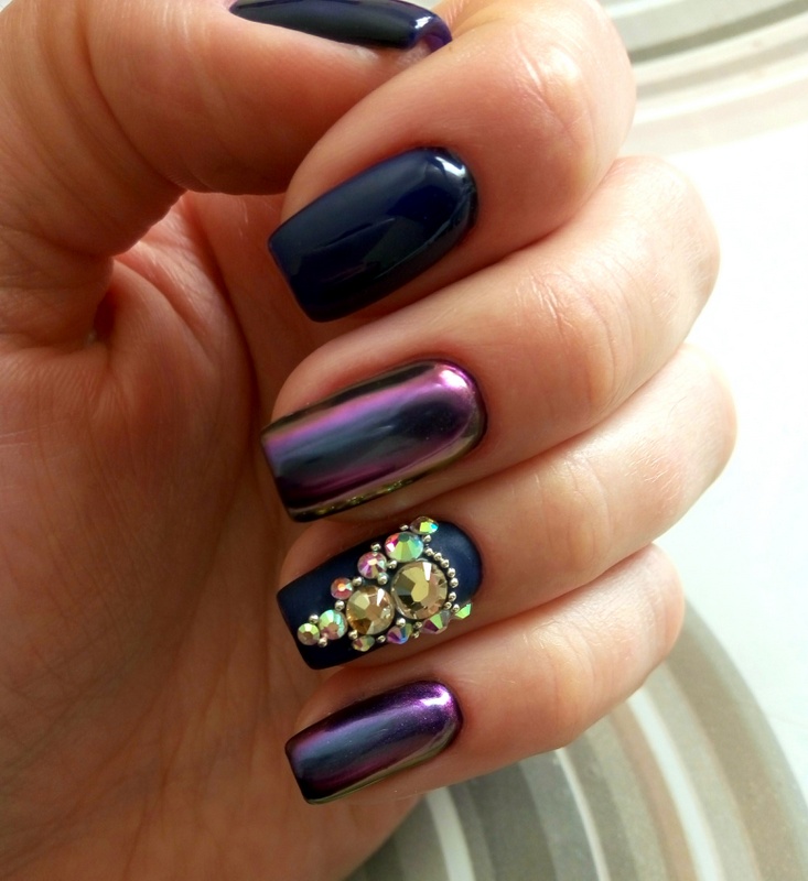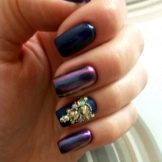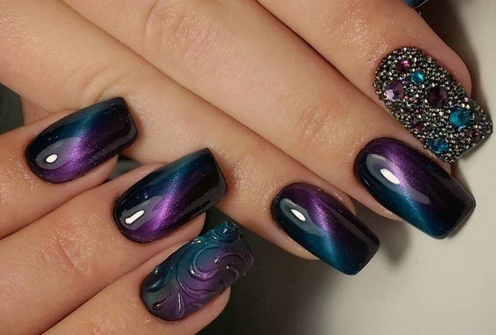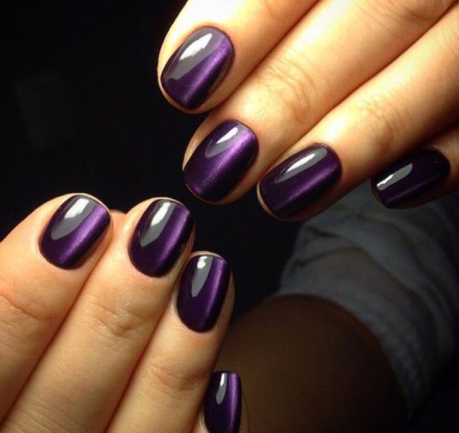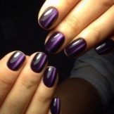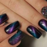 - Manicure "cat look" - the one whose glare adds to the image of the fairer sex of femininity, mystery, mystery, nobility and charm. It looks quite interesting with casual wear, looks perfect with a black or purple dress. The design is somewhat reminiscent of space manicure. Eggplant overflows look very attractive on the nails.