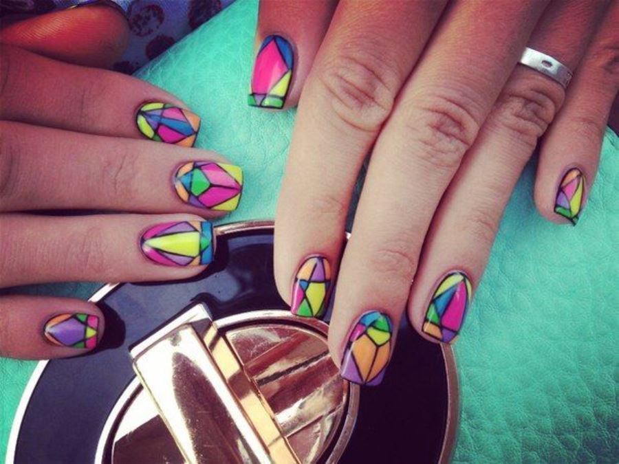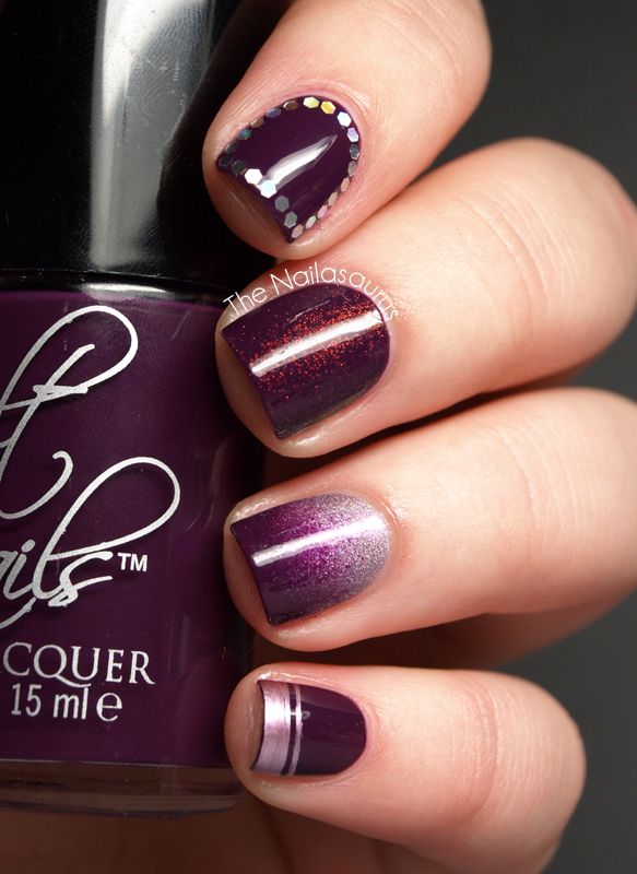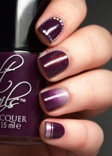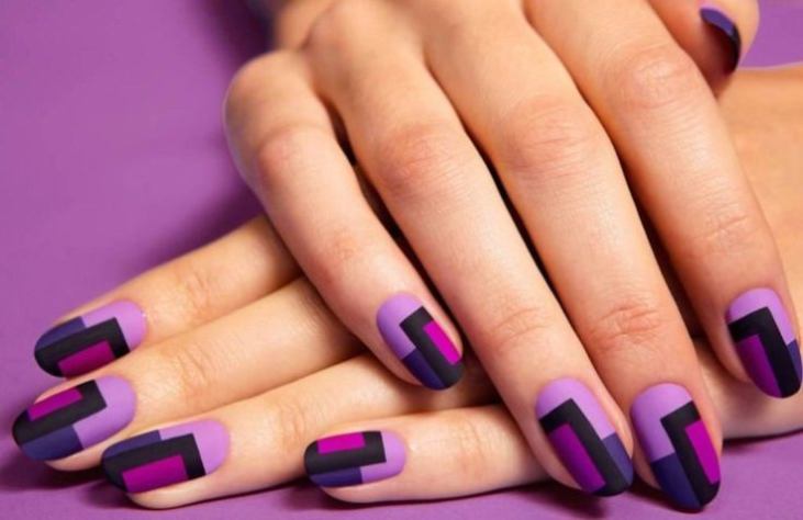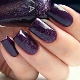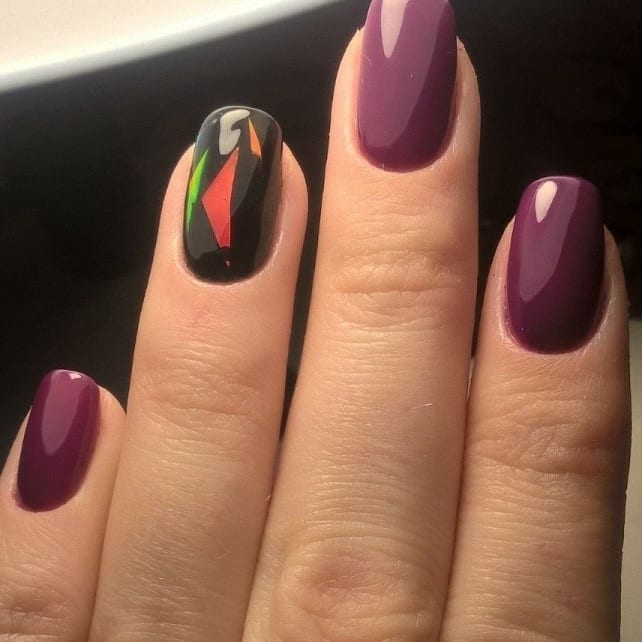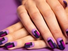 - If the lady does not want the image to be too boring and dull, she can add to it a bit of enthusiasm and fun by original multi-colored "geometric" manicure. It uses several shades, but it is eggplant that immediately catches the eye. Design suitable for fun and fun events, New Year's party or a disco in honor of the birthday. A great option for young girls and girls. Older women will not look very attractive, and maybe even stupid.