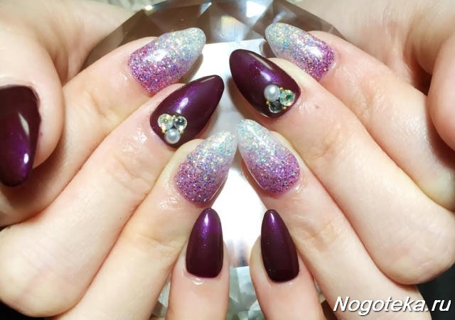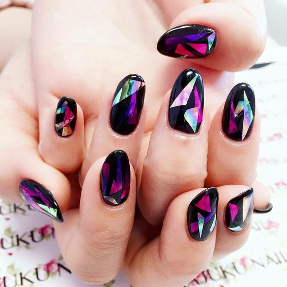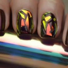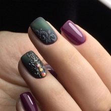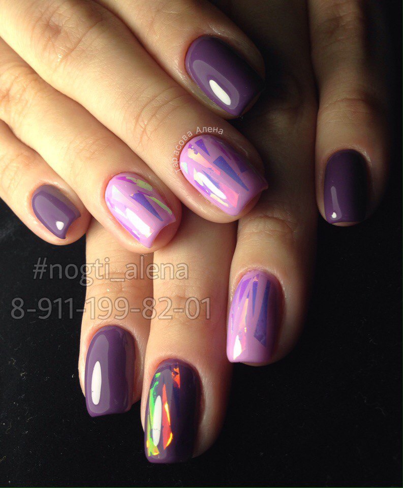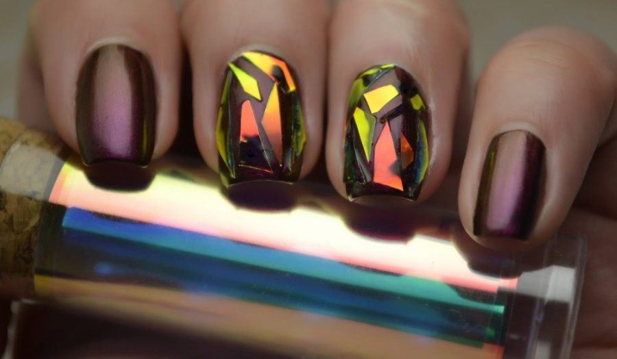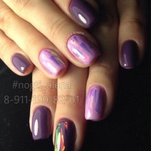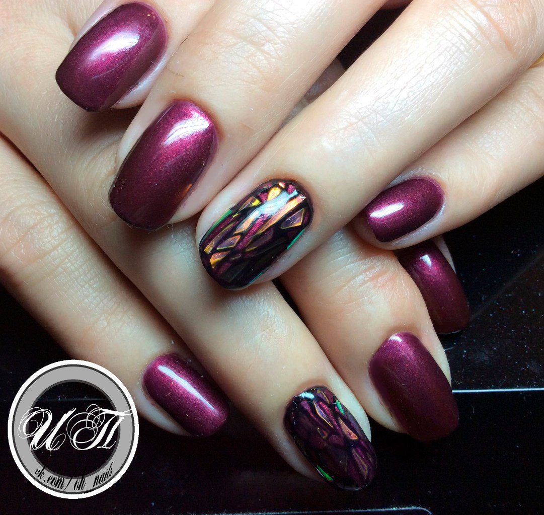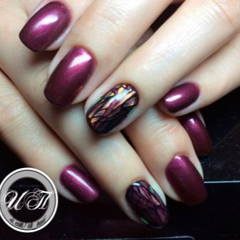 - Broken glass - An interesting and original manicure that looks pretty simple, but at the same time does not lose its chic. Here you can use other shades, combining the color of eggplant with pink or blue. It is used as a background on which is placed a beautiful pattern that seems to be voluminous.