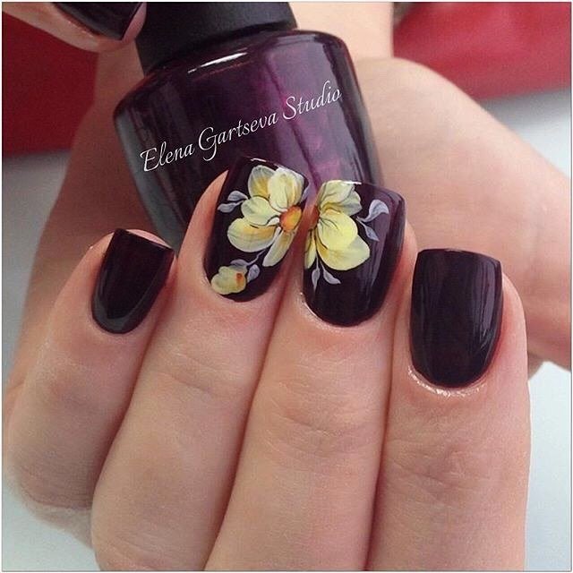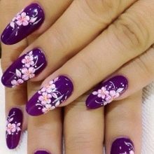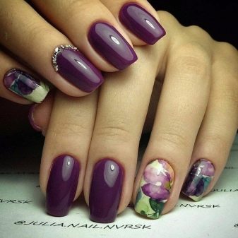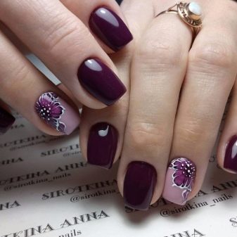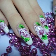 - Flowers - what adds to the image of a girl's femininity, openness, lightness, girlish simplicity and elegance. Drawing beautiful, bright colors is suitable for celebrating serious events, but it is not a good option for working days, as it will look too pretentious. A girl should remember that this is a festive manicure that is incompatible with classic costumes and workplace.
