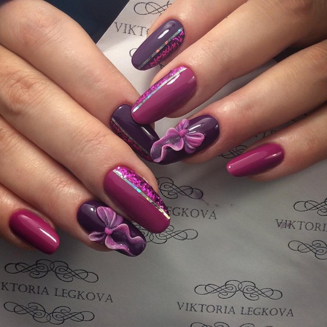 This design fits perfectly to any image., whether it is a romantic and tender young girl or a fatal, sexy lady. Eggplant color gives the bow its highlight. He looks expensive, it blows from the aristocracy. This color is perfect for evening events, office work or an attractive daily look. Another advantage is that it can be suitable for owners of both short nails and long nails.