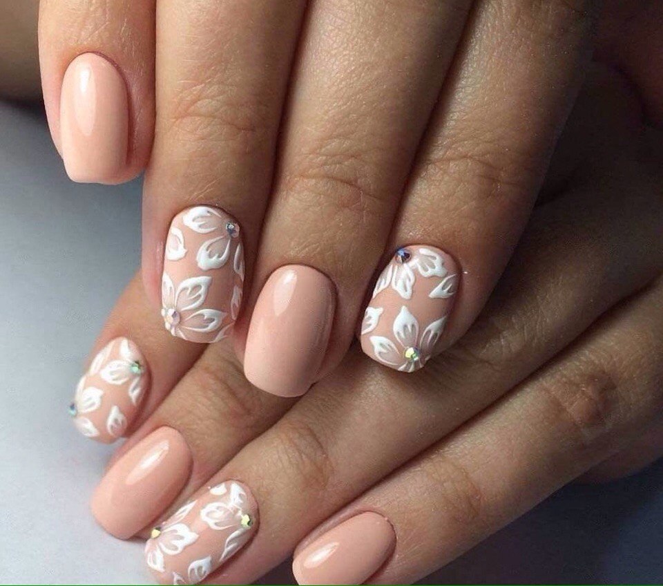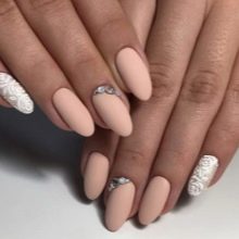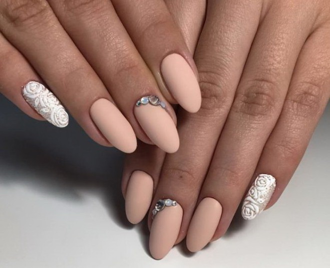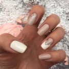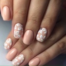 Many people think that neutral shades are suitable only for short square nails, but this is far from the case. A beige-white manicure will look equally good on both long and short nail plate of any shape. It all depends on the selected pattern. If you prefer large elements of decor, they can visually reduce the nail, so it is best to use them on long nails. And, on the contrary, small rhinestones, flowers and other elegant jewelry are perfect for short nails.