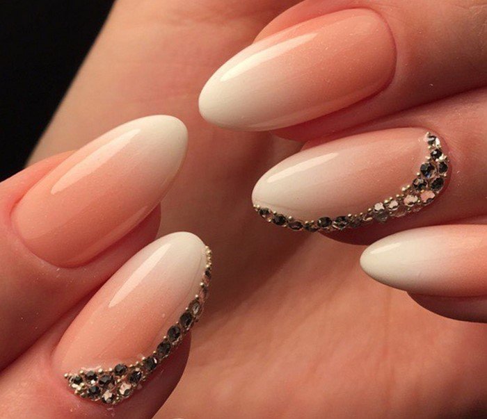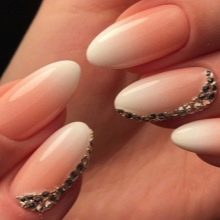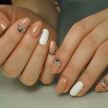To decorate a neutral ombra manicure, rhinestones of delicate shades are used, which are applied in a small amount on each nail or decorate with their ring and middle fingers. In addition to the various jewelry options, you can play on a combination of beige and white varnish of various textures. Rough surfaces are in fashion today.