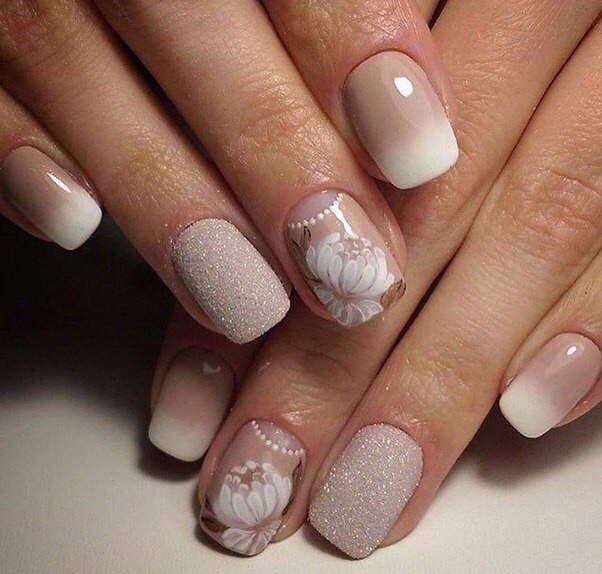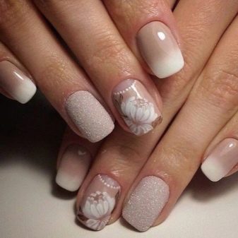 - Ombre effect. The combination of beige and white is traditionally attributed to french. One of the varieties of French manicure is ombre in these tones. In this design variant, the smoothest transition from beige to white is used, and not the bright strip on the tip of the nail. This type of design of the nail plate is suitable for both office style and for a wedding or other celebration.
