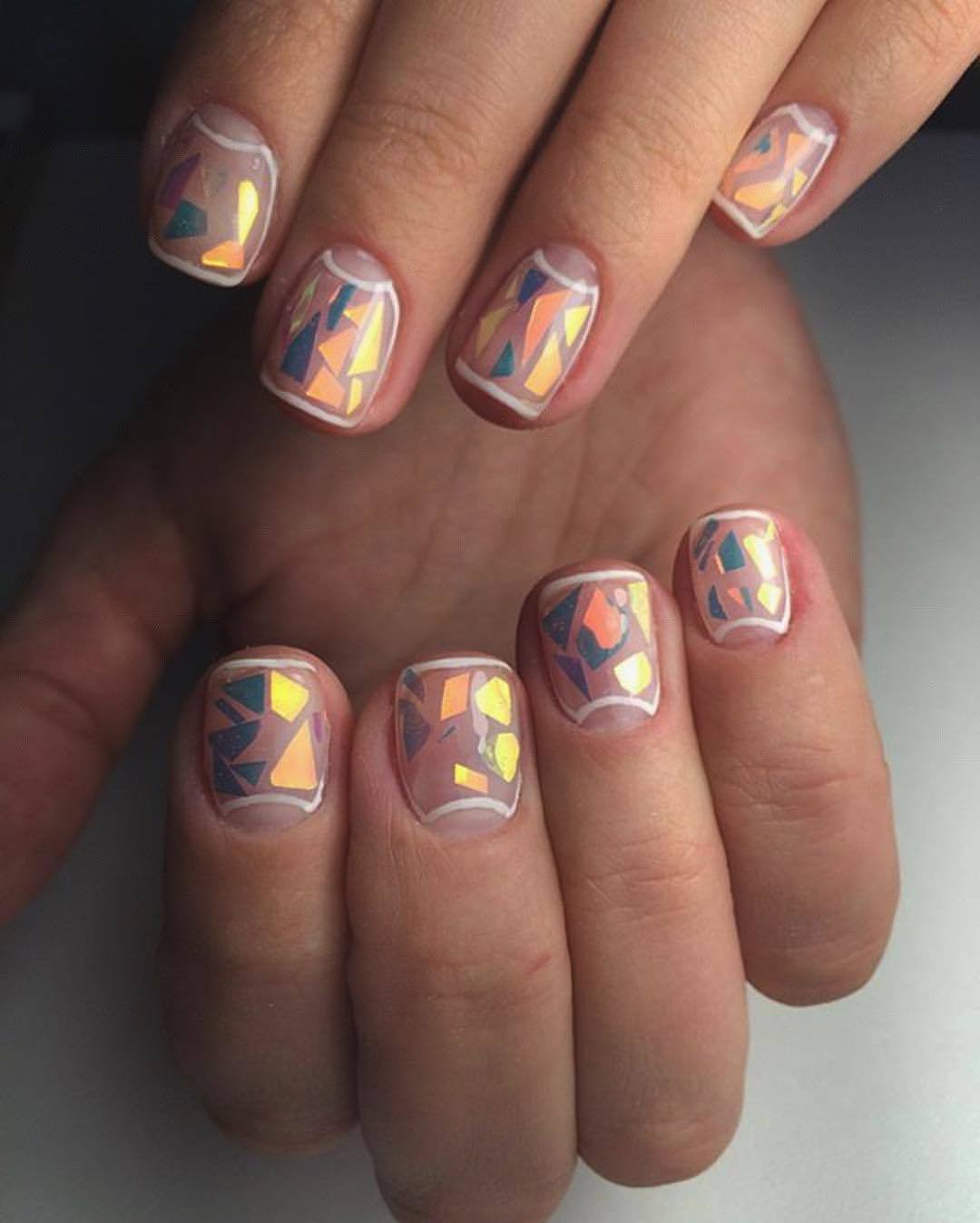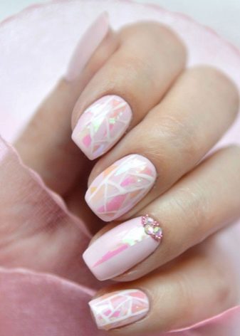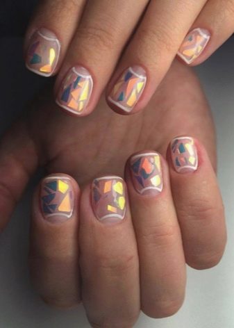 - Broken glass. Although accustomed to seeing him in a brighter manicure, but in nude shades it will look great. Its reflections will look appropriate both on the beach and at a club party. The mirror surface perfectly reflects the light falling on it.