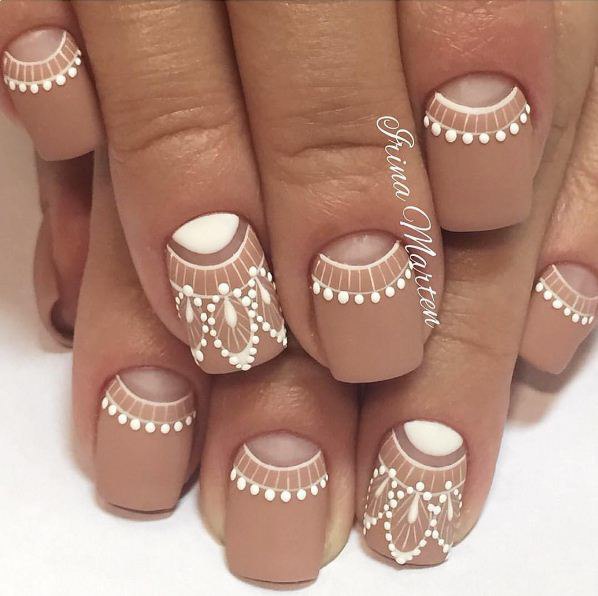 Contrary to our usual opinion, beige with white manicure can be not only French. In addition to the classics, nowadays, patterns over neutral tones, as well as an ombre design, have become fashionable.