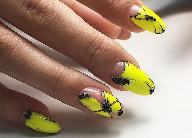Black and yellow nail design with a pattern looks very original. As an image, you can choose butterflies, flower motifs, exotic fruits, lace, geometric abstractions, bows. If to add such manicure with small pebbles, smooth transitions and bends, it will add grace and femininity to the image.