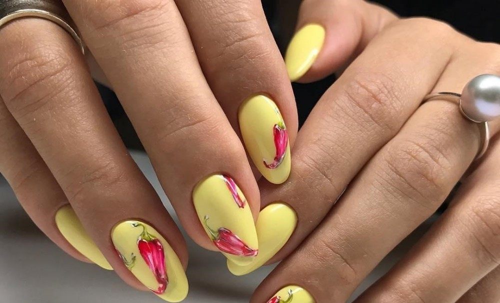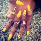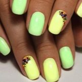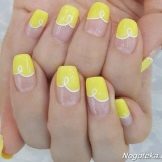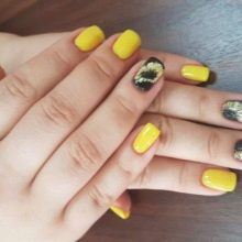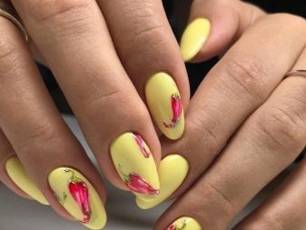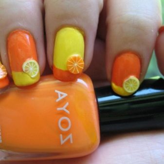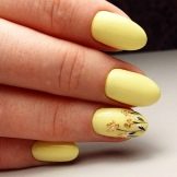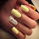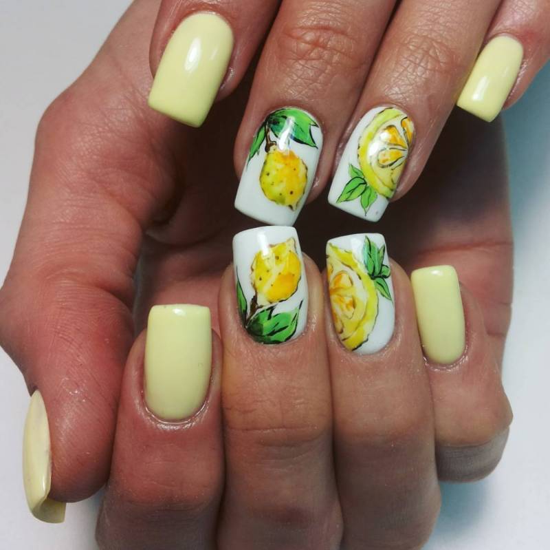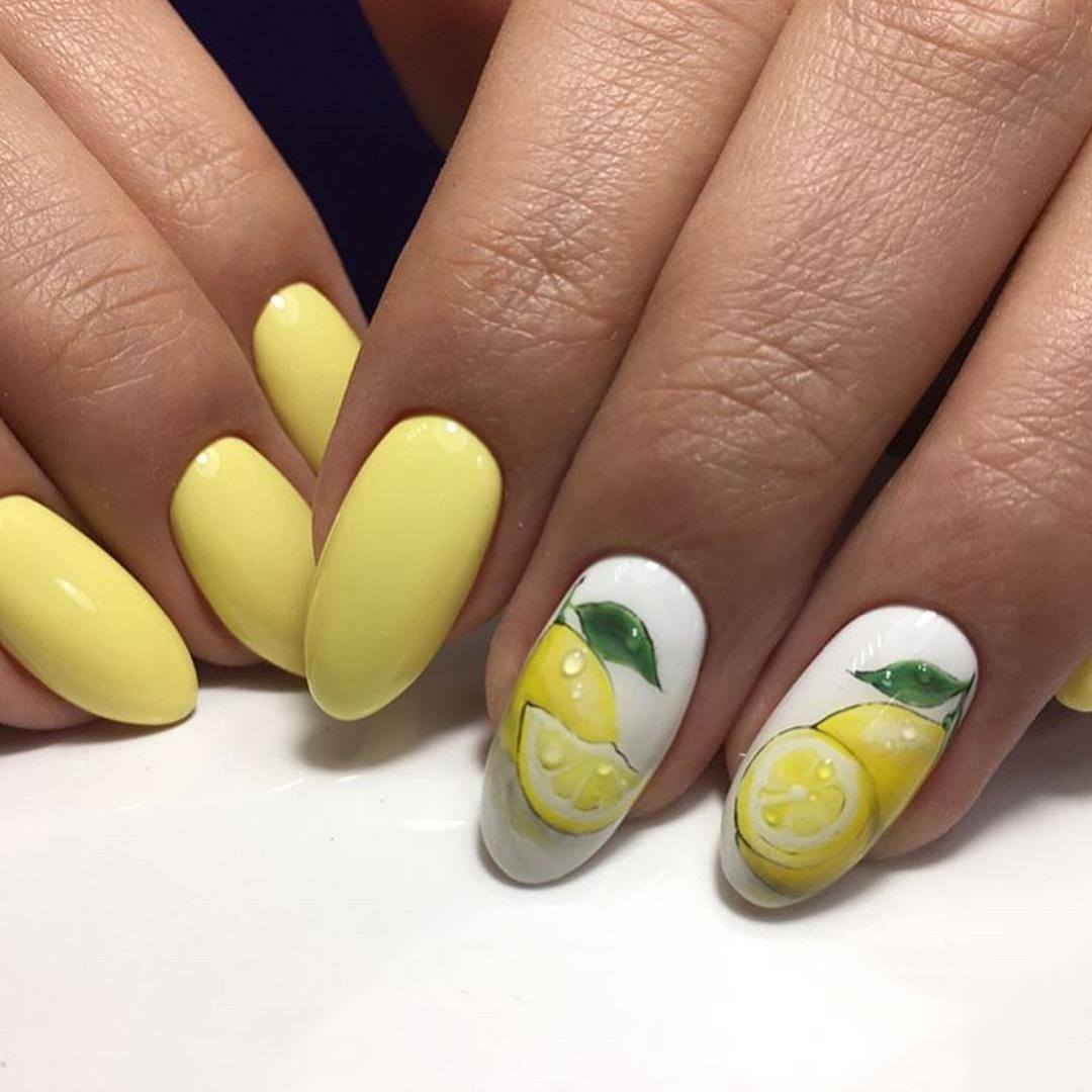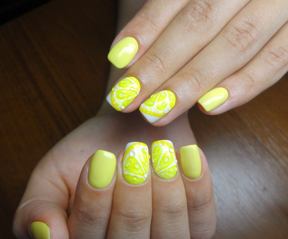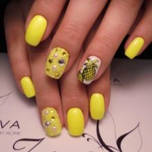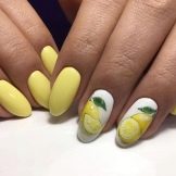 Since this is a summer manicure, the main theme of the drawings are fruits. Given the name of the color, the nails are often decorated with lemon slices. To make the picture stand out noticeably, it is necessary to use a lacquer that is brighter than the background coating. To dilute the yellow gamut, add shades of green, using them to draw the foliage. You can draw slices using special stencils and special brushes, but it is better to use the services of experienced craftsmen.