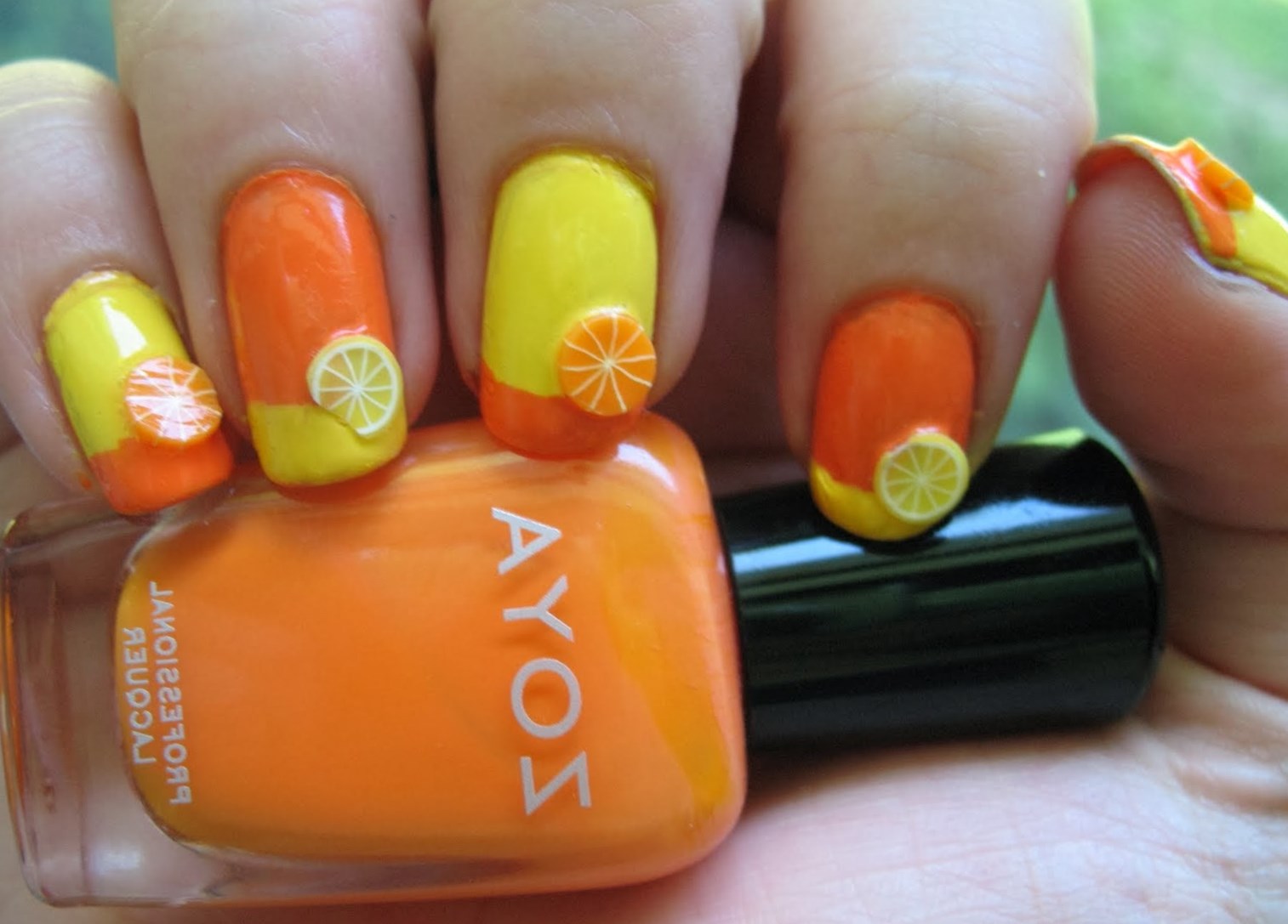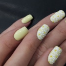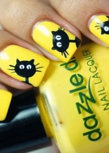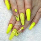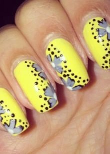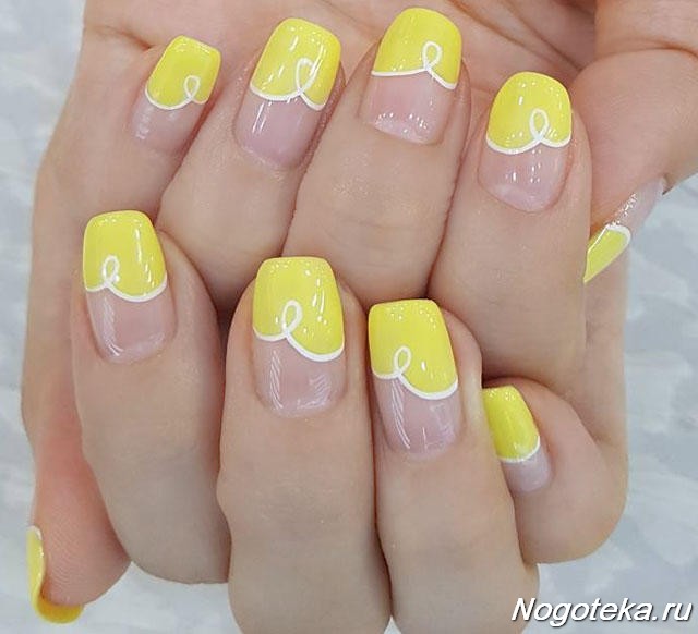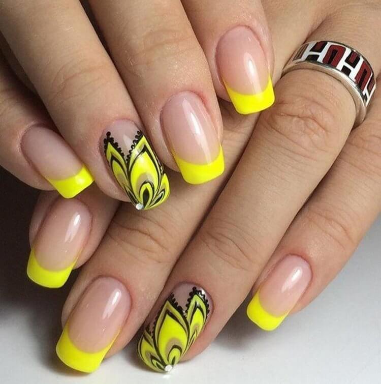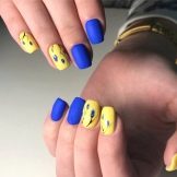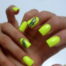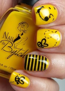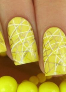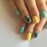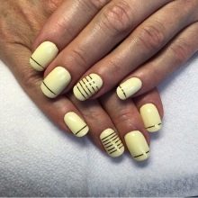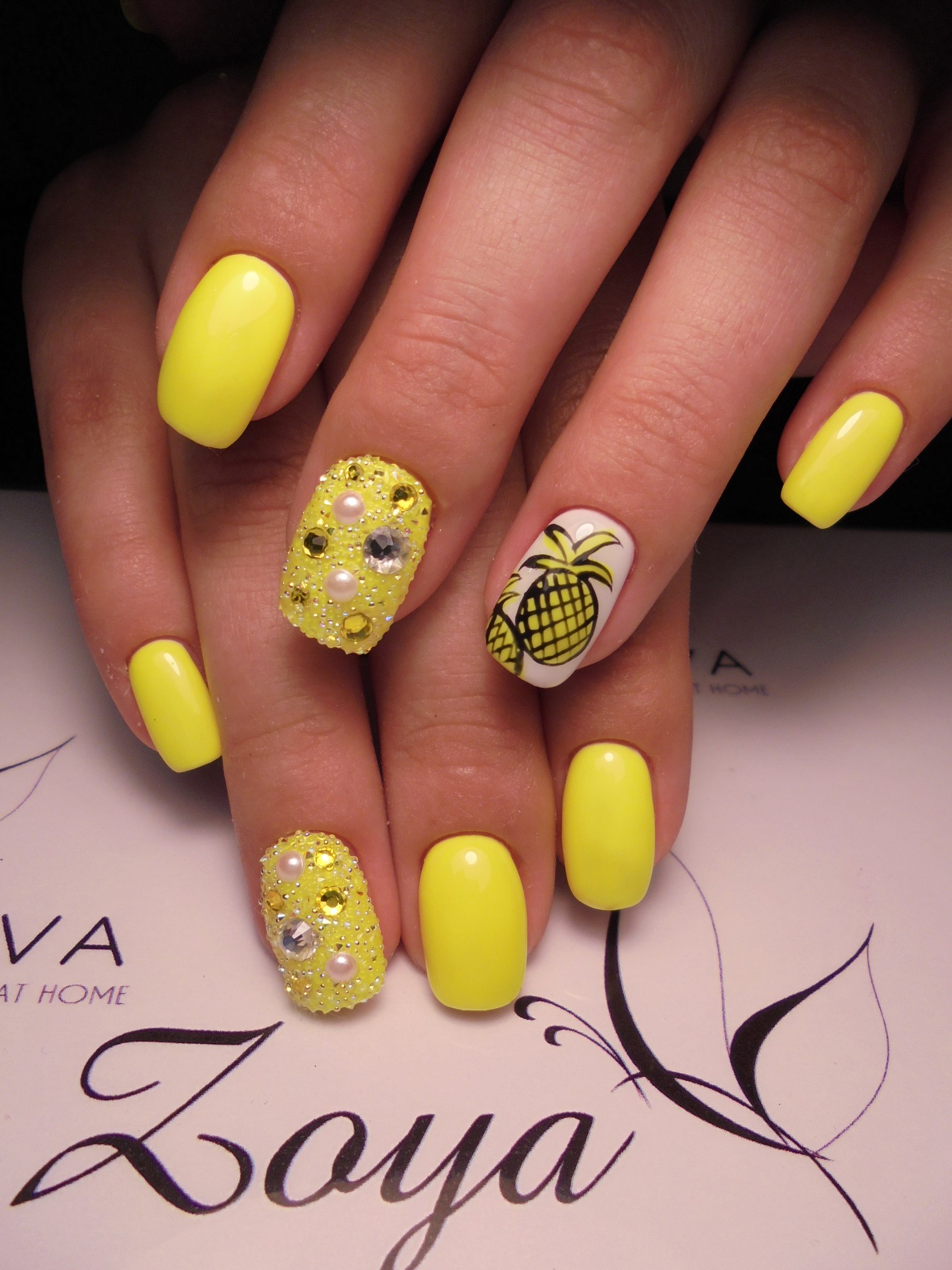 Since this is a summer manicure, the main theme of the drawings are fruits. Given the name of the color, the nails are often decorated with lemon slices. To make the picture stand out noticeably, it is necessary to use a lacquer that is brighter than the background coating. To dilute the yellow gamut, add shades of green, using them to draw the foliage. You can draw slices using special stencils and special brushes, but it is better to use the services of experienced craftsmen.