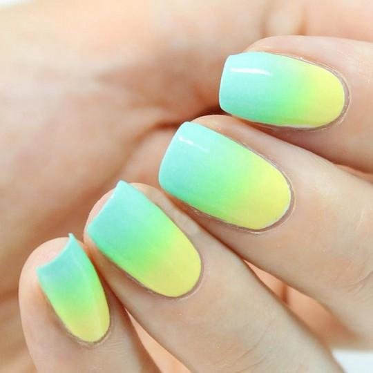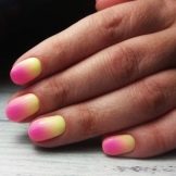 Ombre technique looks great with rich varnishes. With the use of lemon tones, gradient manicure looks great. When combining shades, remember that the bright colors of yellow dominate over the other colors of the spectrum, so it must be used carefully and metered.