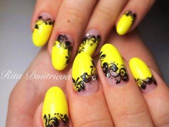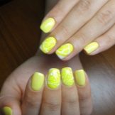 Modern women of fashion are attracted by lemon varnishes, which are associated with tropical fruits and exotic landscapes. These are tones such as yellow-green, honey, yellow-orange and many others. It can be both translucent varnishes, and dense structures with thick color. These varieties of color palette perfectly combined with standard shades of lemon, pastel and bright.