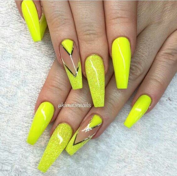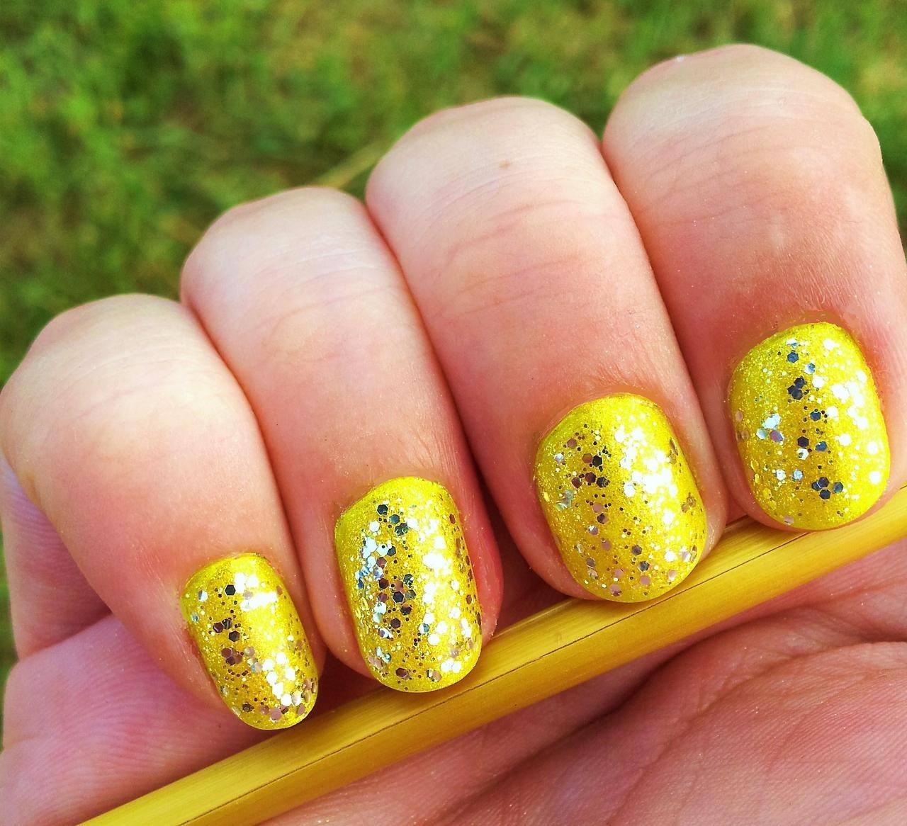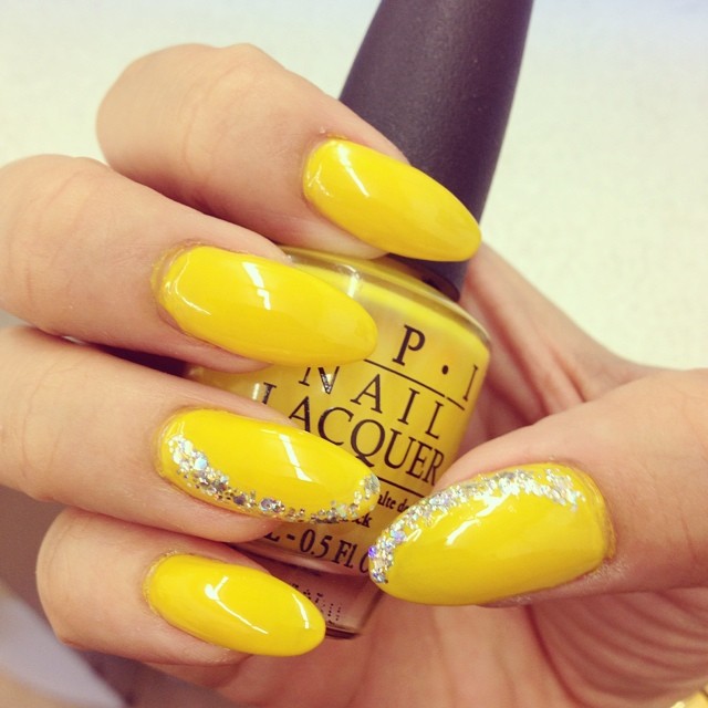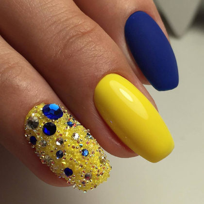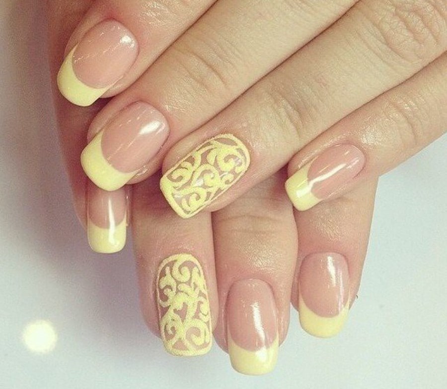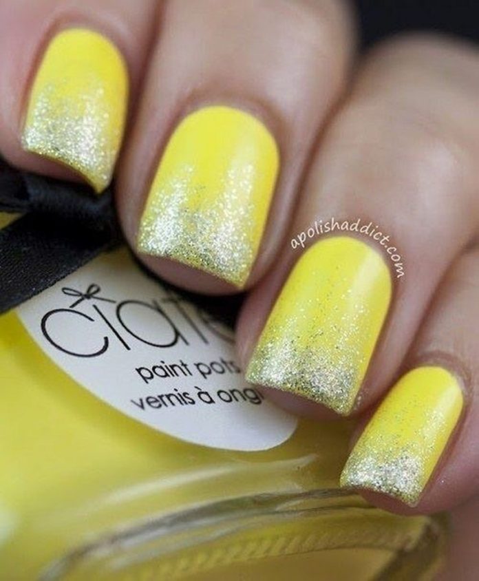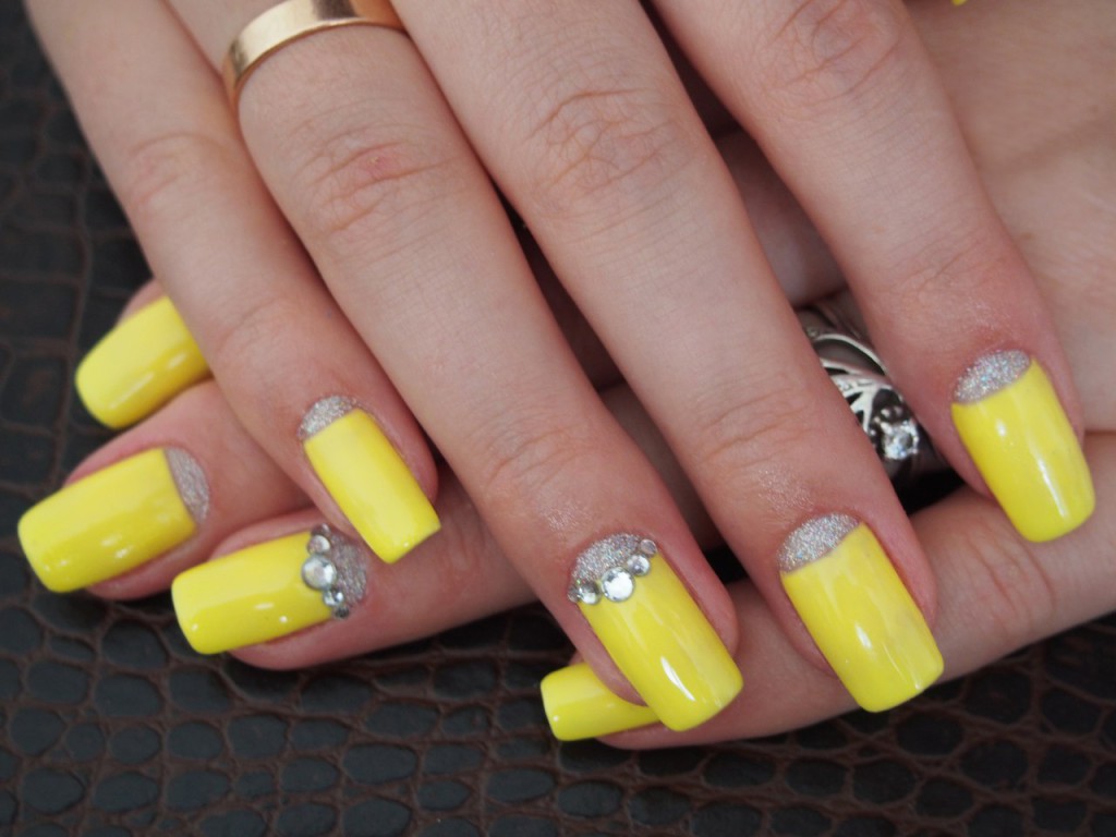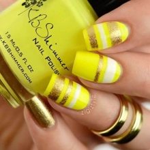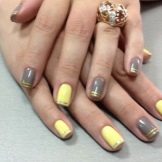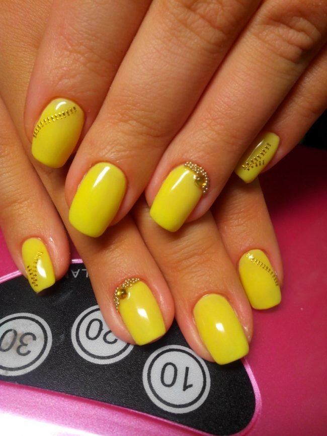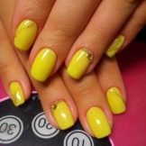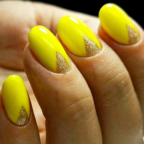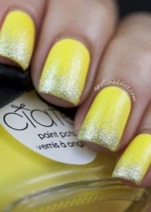 - Gold. Golden color perfectly complemented lemon manicure. The best choice for those who wish to make a juicy and elegant decor. Brilliant elements will add a touch of glamor and luxury to the design.