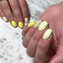 Bright and charming lemon manicure is fully revealed in the warm season. This color looks great in combination with summer clothes and gives the overall look of elegance without unnecessary obsession. The nails, decorated with lemon varnish, accentuate the bronze tint of tanned skin, making it more attractive. The tone has found its application in numerous techniques and is relevant this season.