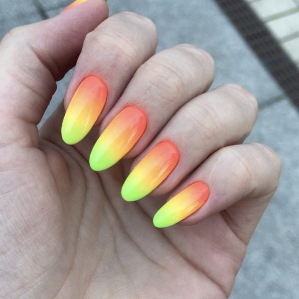 Original and interesting to decorate your nails can be rainbow ombre with the addition of lemon hue. The effect of a smooth color transition can be both vertical and horizontal.