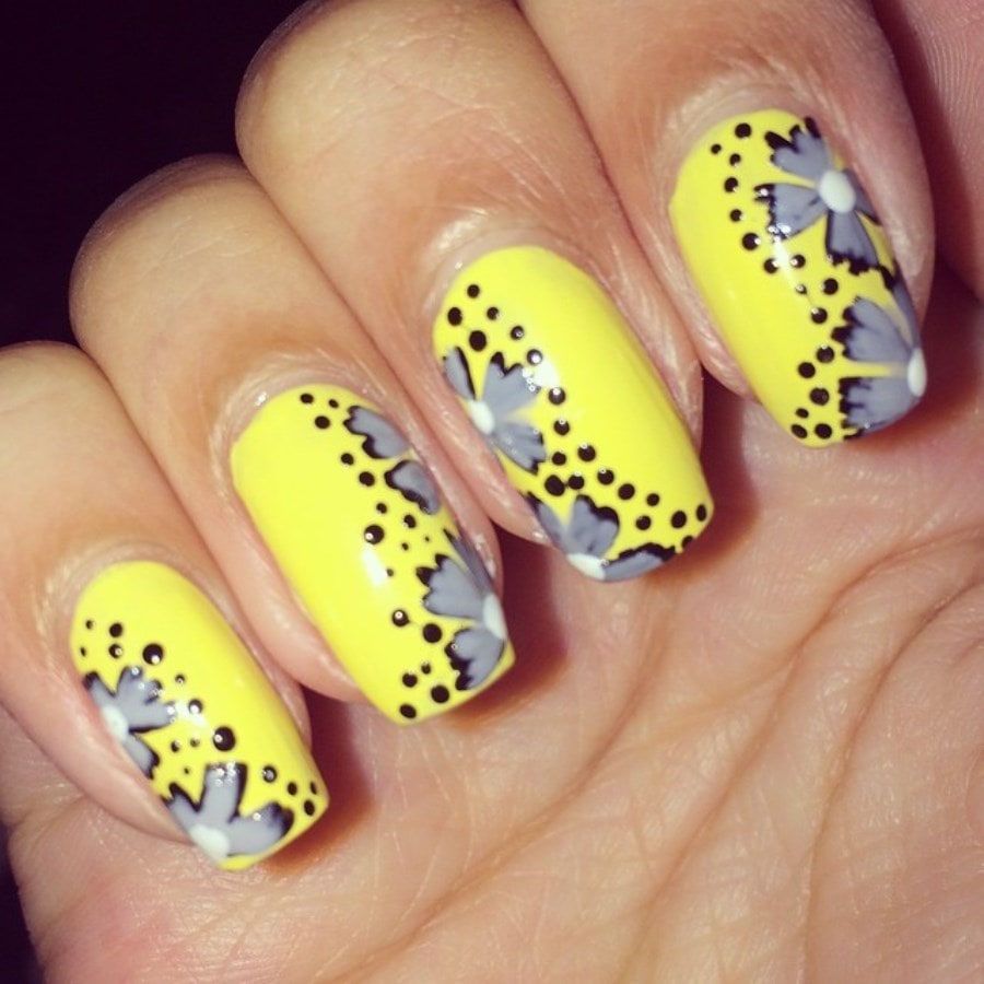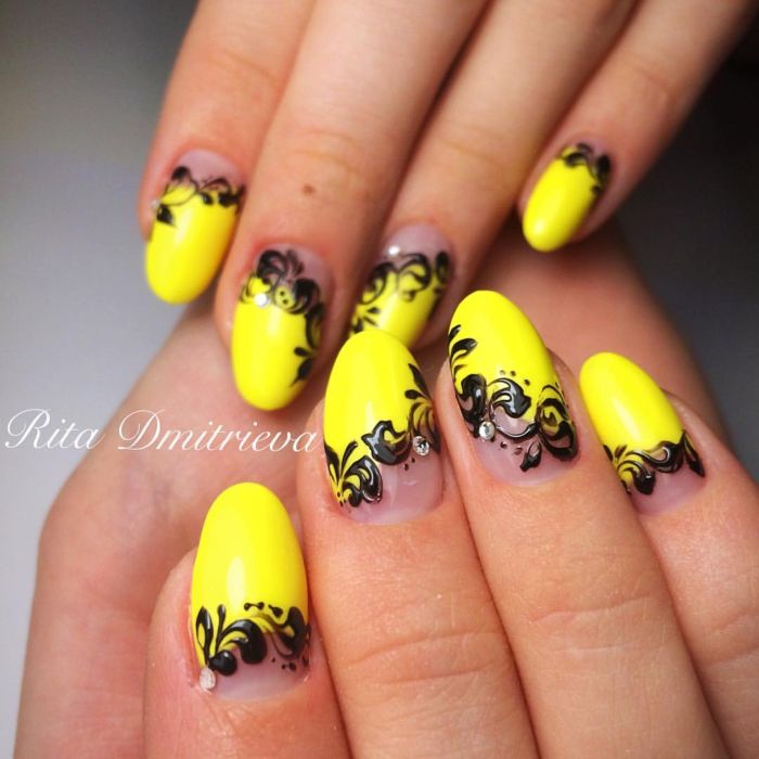- The black. Achromatic color is appropriate in combination with all the colors of the spectrum, and lemon tones are no exception. There is an expressive and memorable combination. The second color is often used for drawing individual parts in order to focus on them. A duet of black lacquer with lemon will also look great at a ratio of 50: 50.