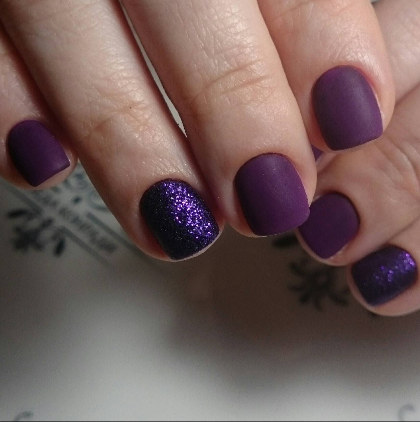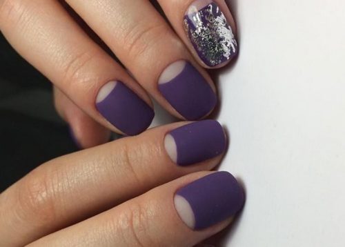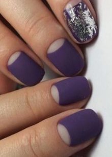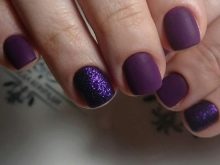 Glitter nails give a festive look. Matte purple manicure can be supplemented with a shiny strip of gold or silver color on the tip of the nail or at its base. Using a thin brush, they can be stretched to the entire surface of the nail plate or to its middle. A great option would be to put purple glitter on the ring finger, while everyone else will remain dull.