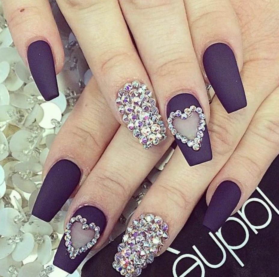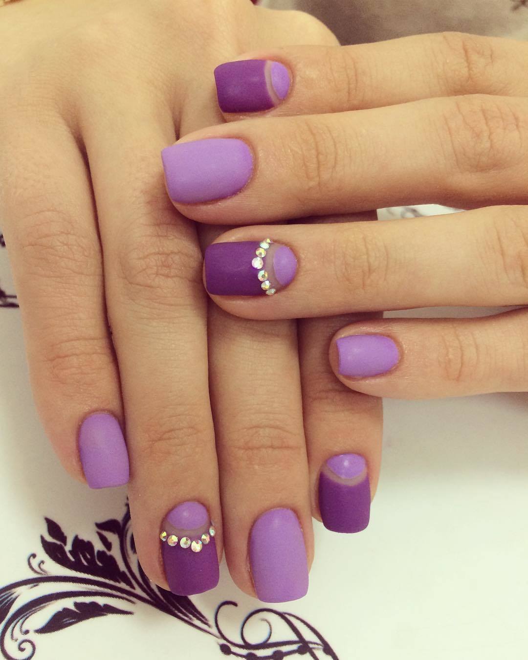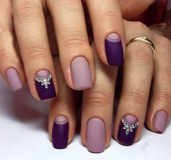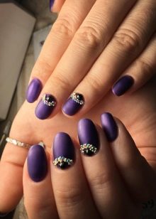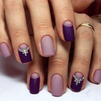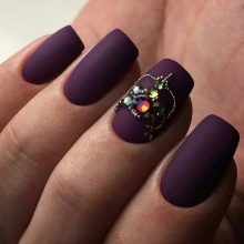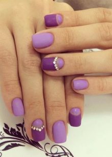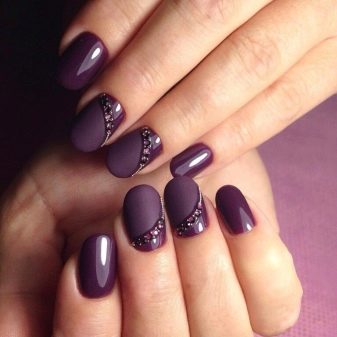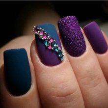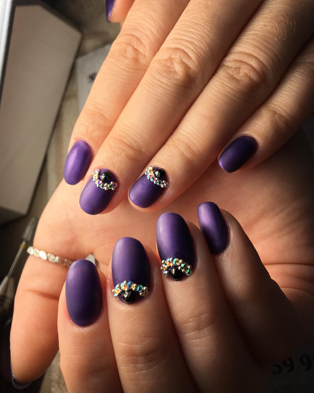 Matte manicure and rhinestones have always been a relevant combination that is suitable for a festive event. Under the purple lacquer fit any color of rhinestones. As a rule, rhinestones are placed on only one finger, however, if the dress code allows, they are distributed over several. From brilliant stones they create real masterpieces on the nails, which in bright light shimmer like diamonds.