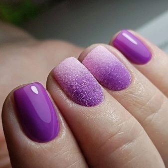 Ombre on the nails looks both original and elegant. As a base applied clear varnish. A piece of sponge is painted in the right shades, after which it is pressed to the nail. The transition from violet to lilac, white or black will look beautiful.