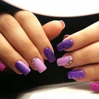 Purple lacquer can be applied solo or in combination with other shades. It goes well with lilac, pink and pale blue. The most optimal manicure will be with white or black additional color.