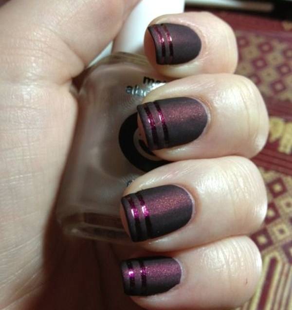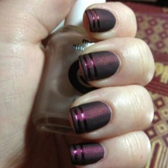 Bright stripes with a glossy shine look futuristic over a matte manicure.They are sold in bundles in specialized stores and are quite inexpensive. With the help of tapes with a sticky base, you can visually lengthen the fingers, if you glue them along the nail.
