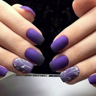 Very beautiful on long nails looks a combination of glossy and matte texture. Fashion magazines offer to apply white glossy patterns in the form of curls, letters, shapes, petals or monograms on a matte purple varnish. It is desirable to impose a bright color on a dark purple background that will stand out well, otherwise the pattern will not be visible. If there is a business meeting ahead, you can apply a plain lacquer, so the manicure will look more restrained. A perfect option would be a half-colored, implying a matte surface on one part of the nail and glossy - on the other.