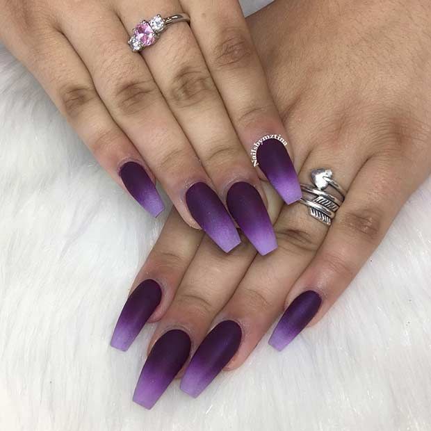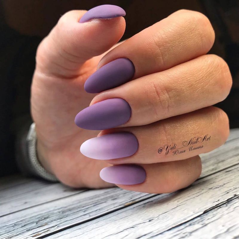 One type of ombre, but not on one finger, but on the whole hand. Starting with a purple little finger, a shade lighter than the previous one is applied to each finger. Thus, the thumb may be white or lilac. In the matte texture, this option looks especially beautiful.
